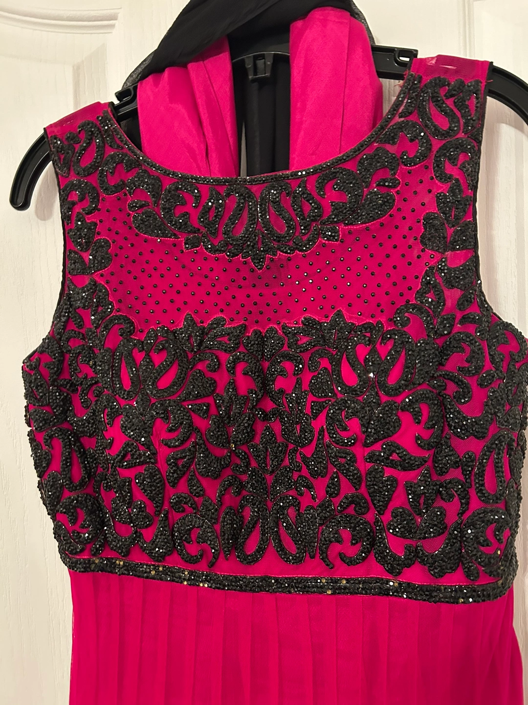 Comes with Silk Magenta Chiridaars and Black Dupatta and built in bra. Sadly it does not fit me.