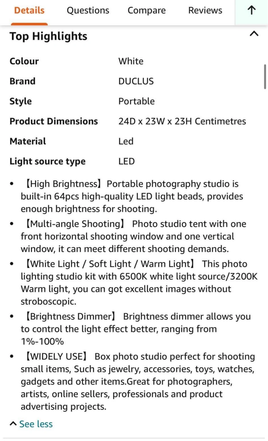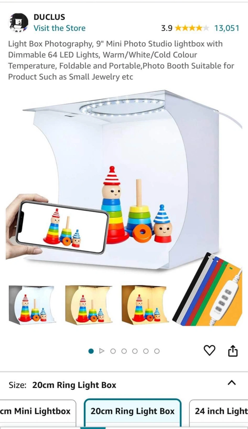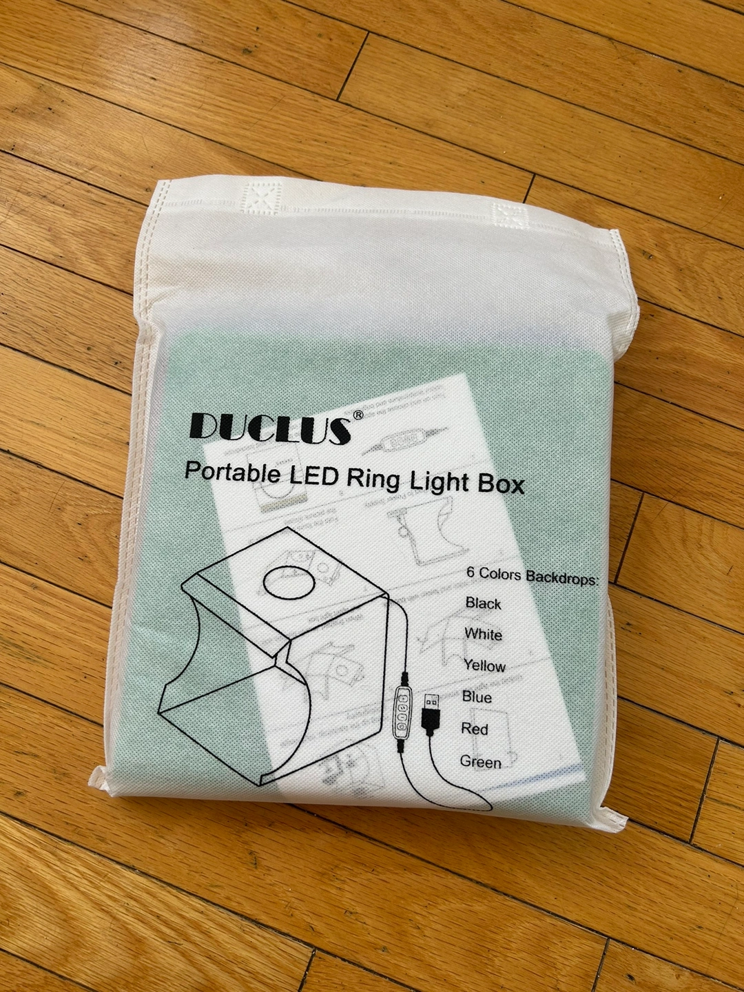 9in led photo light box. has multiple light settings (tone and brightness) and comes with 6 colour backdrops including white and black.