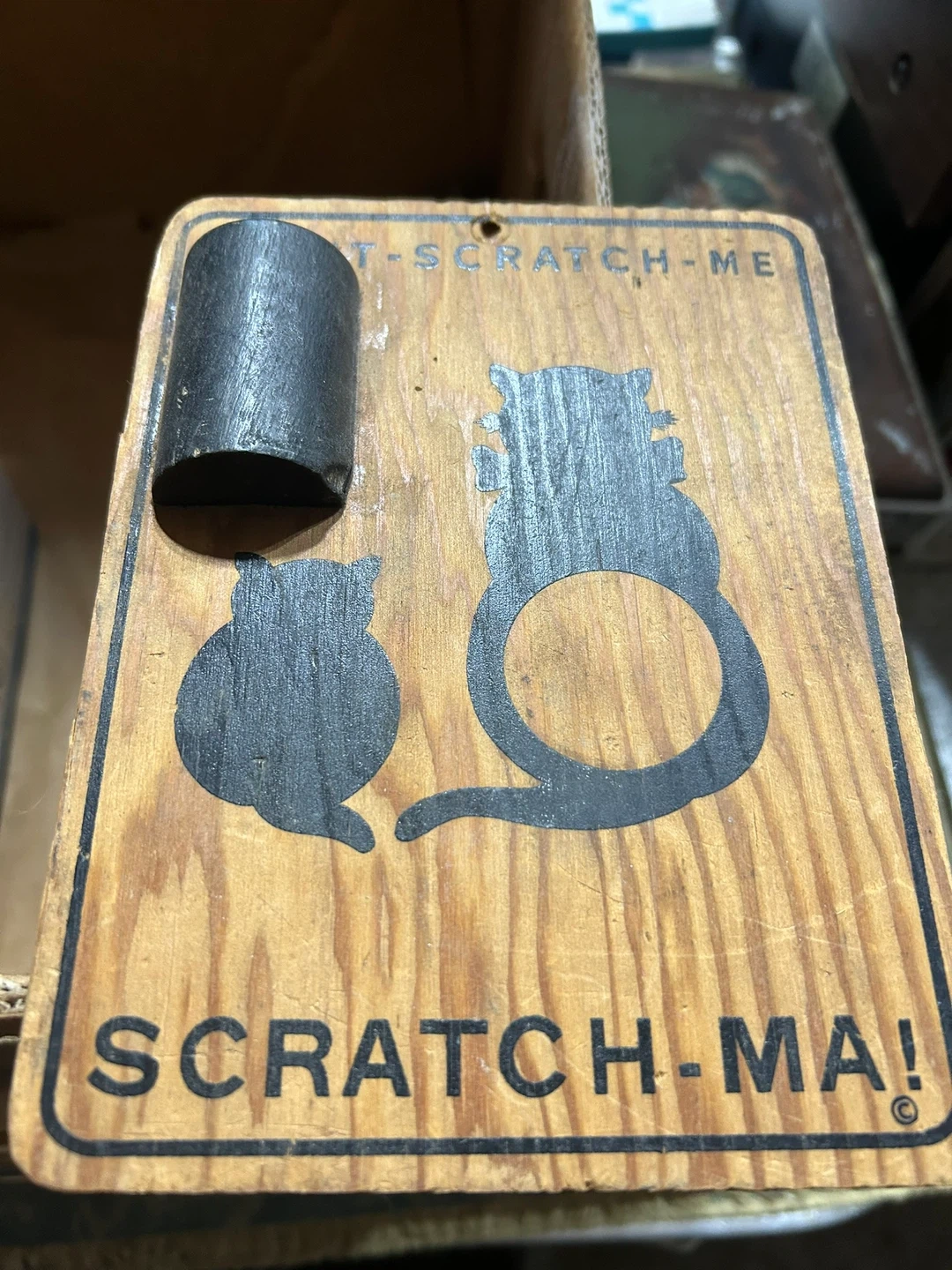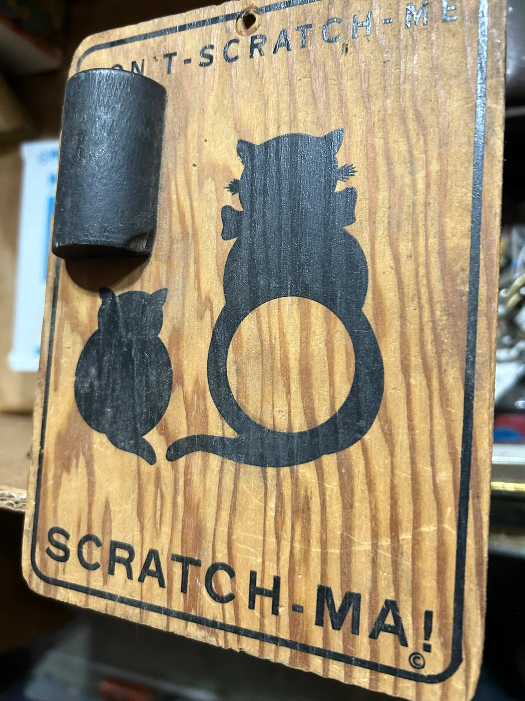 This is a unique wooden sign for your feline friends. It features two cat silhouettes and the words "DON'T SCRATCH-ME" and "SCRATCH-MA!". A small black cylinder is attached for scratching.