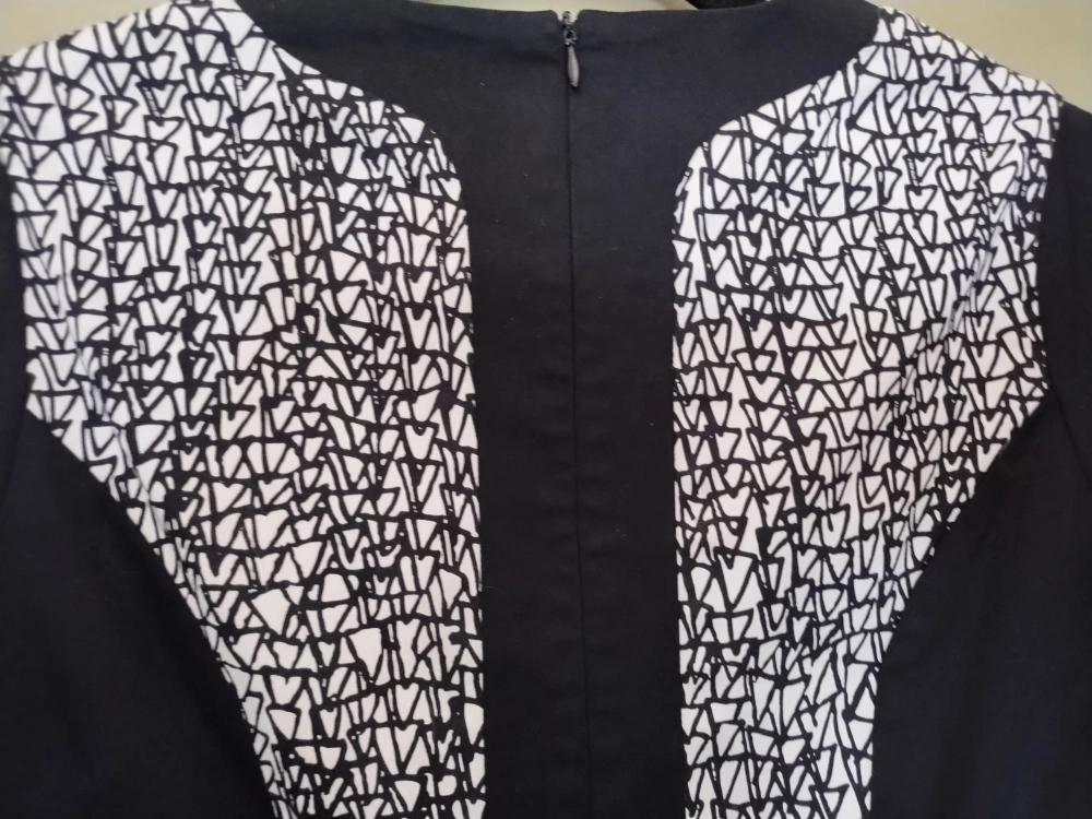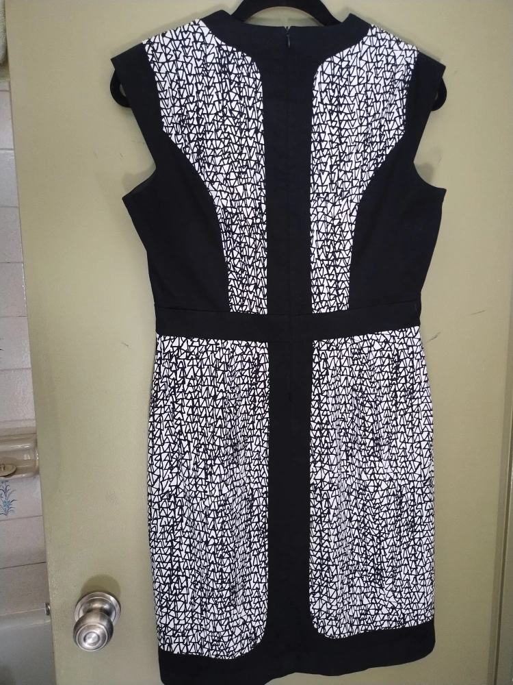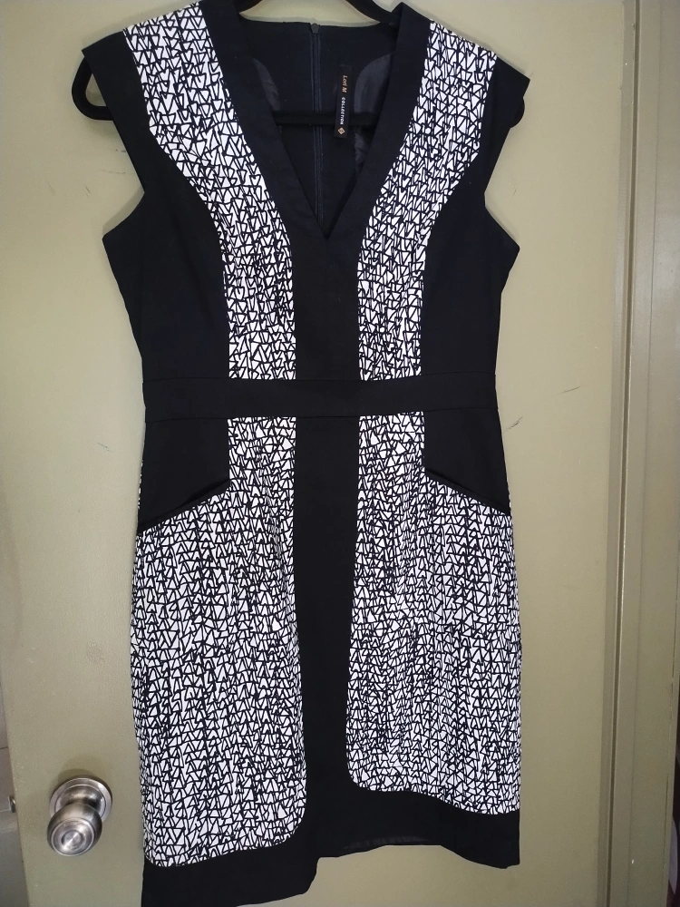 Worn twice, a step up from a casual wear dress, lined and fitted, with front pockets, fabric pattern of small triangles. suitable for office or church.
