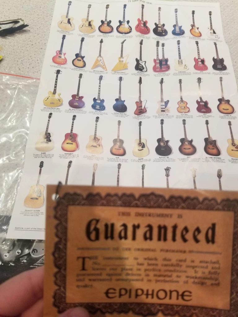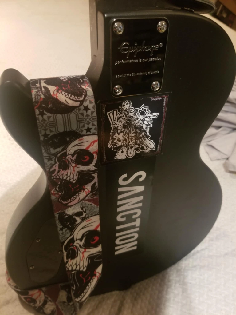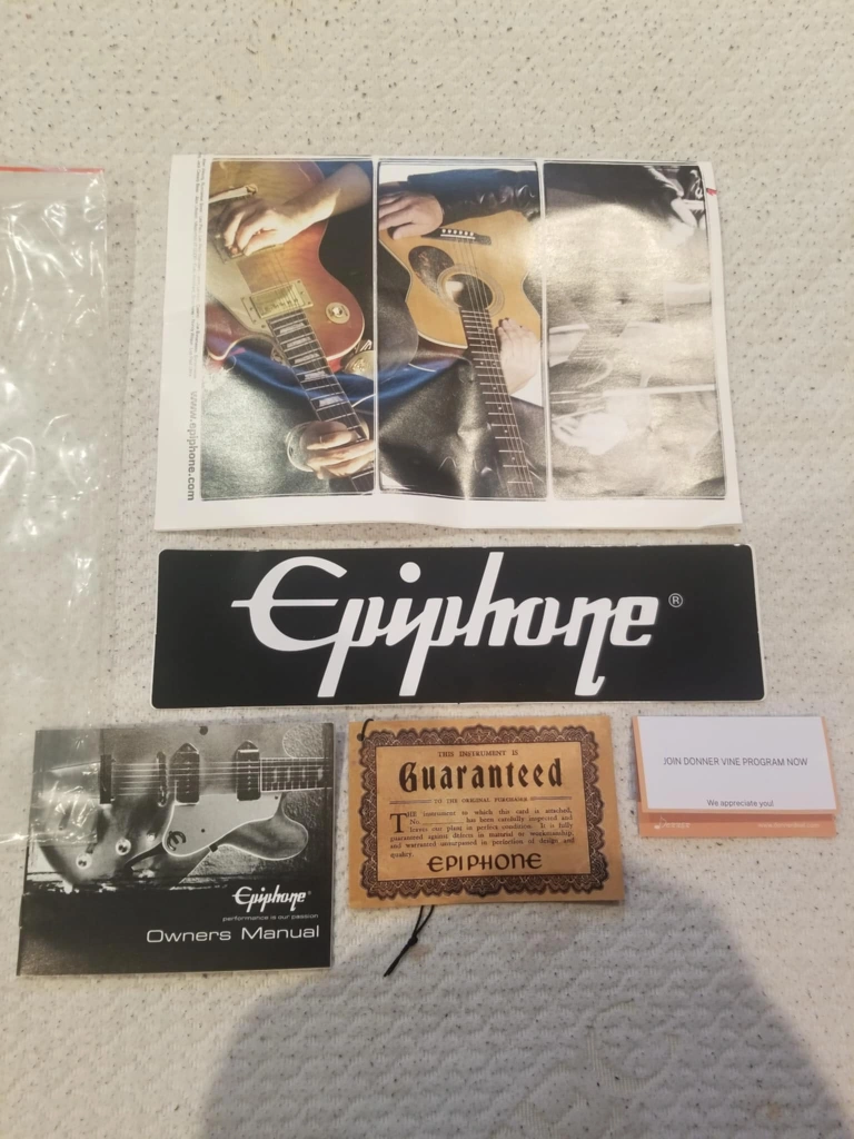 -Comes with the skull strap, 2 capos and some picks with a little pick holder that attaches to the strap, Epiphone sticker, authenticity card and owner manual