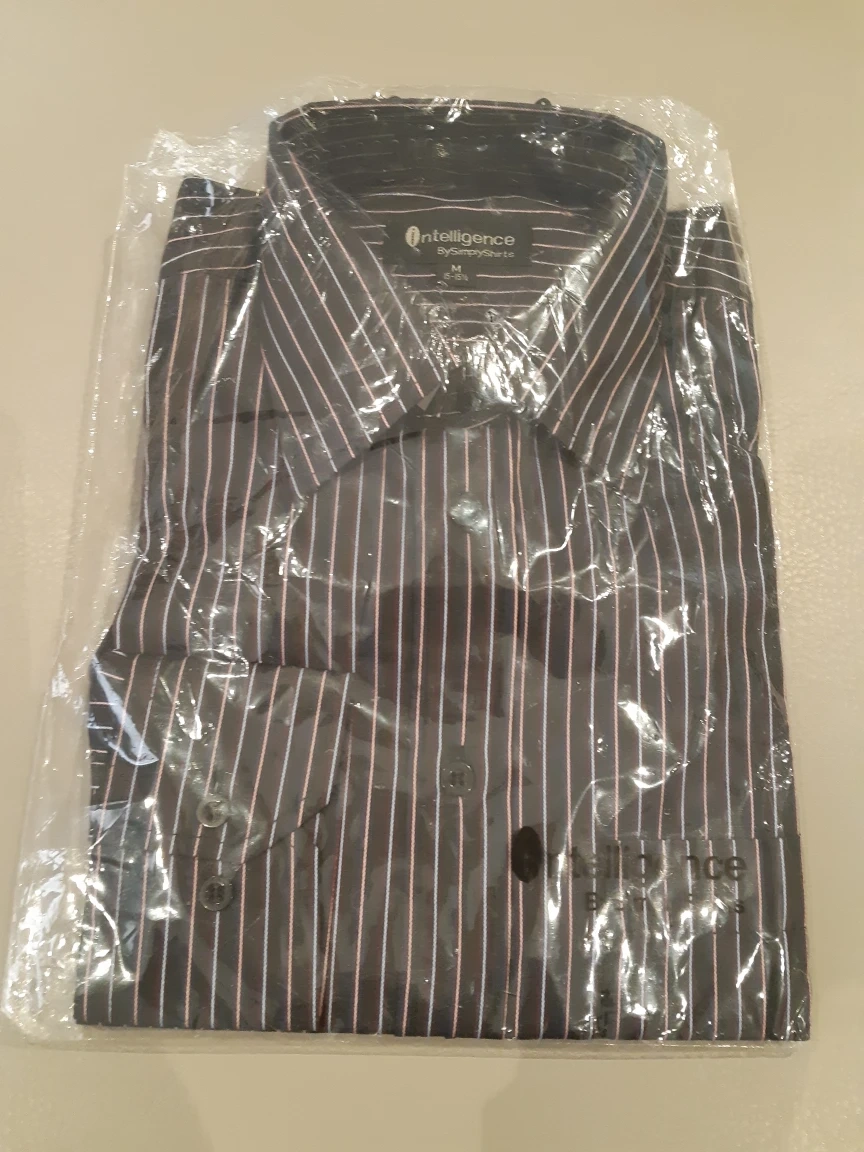 Excellent quality Designer (intelligence) mens dress shirt black with light pink/grey/maroon stripes collar 15 1/2 from pets/smoke free home serious buyers only swipe for more pics