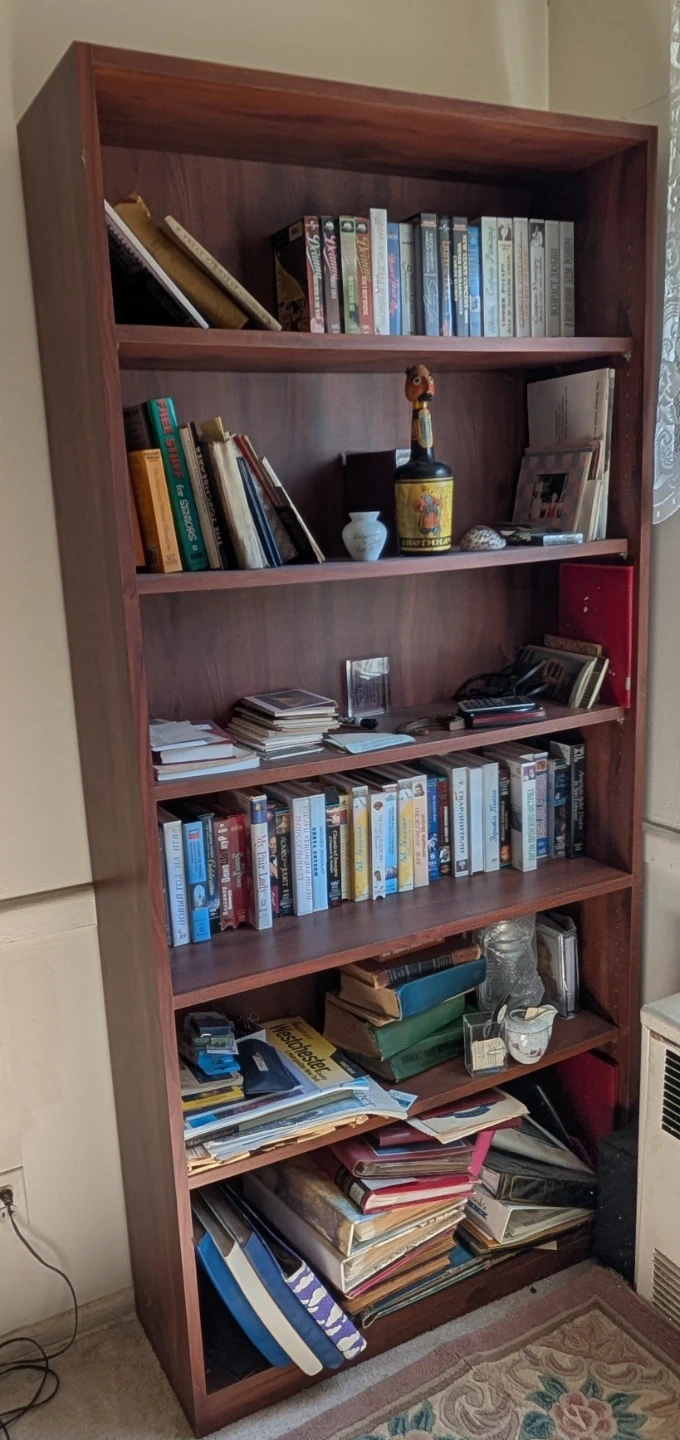 This is a sturdy wooden bookcase with five shelves. It's perfect for storing books, decorative items, or binders. The dark wood finish complements most decor styles. I have 2 of them.