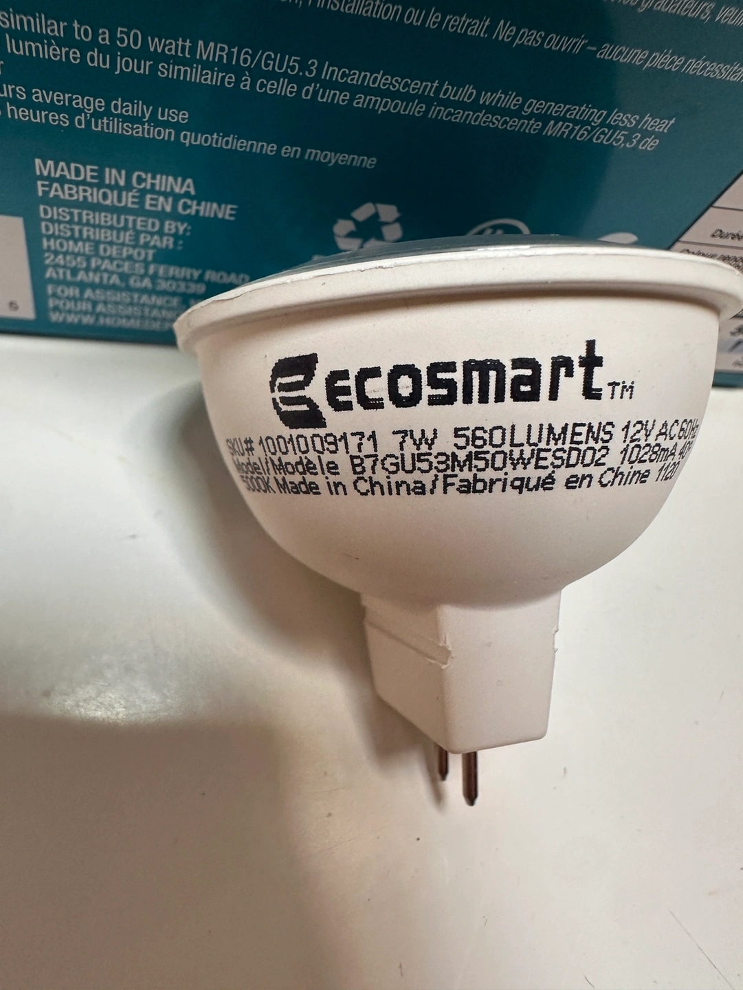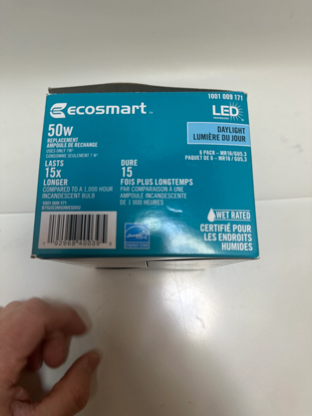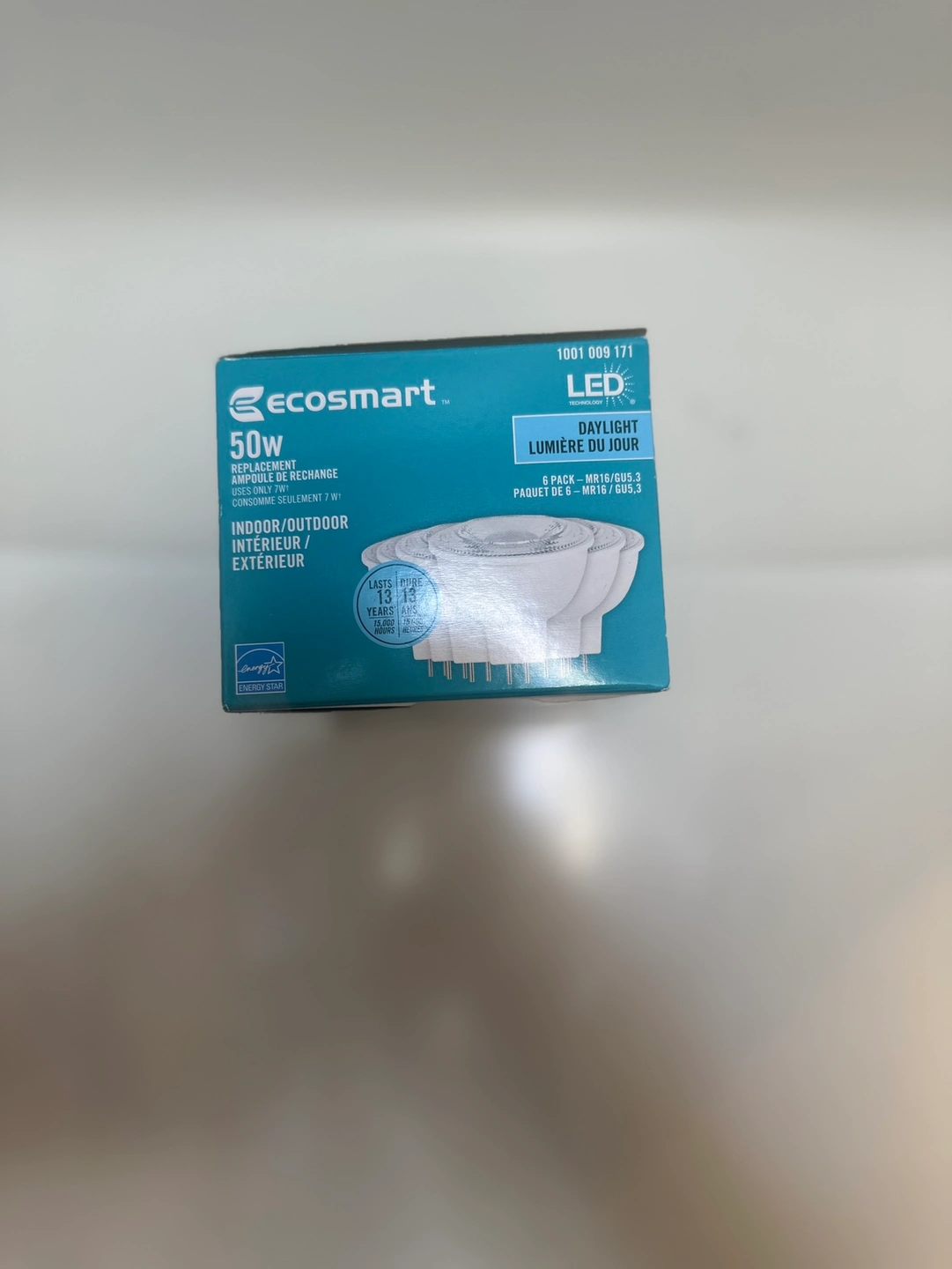Purchased the wrong bulbs, past the return date at Home Depot. They sell for $41.00 - selling them at 50% off to get them gone. Here’s the store description: The Ecosmart 50W Equivalent Bright White (3000K) MR16j LED Flood Light Bulb (6-Pack) is ideal for both accenting and general room lighting. It is instant-on and will not fade fabrics or furnishings. The LED bulb offers energy savings and long life. It is an energy-efficeint replacement for 50W halogen bulbs. ENERGY STAR® certified.