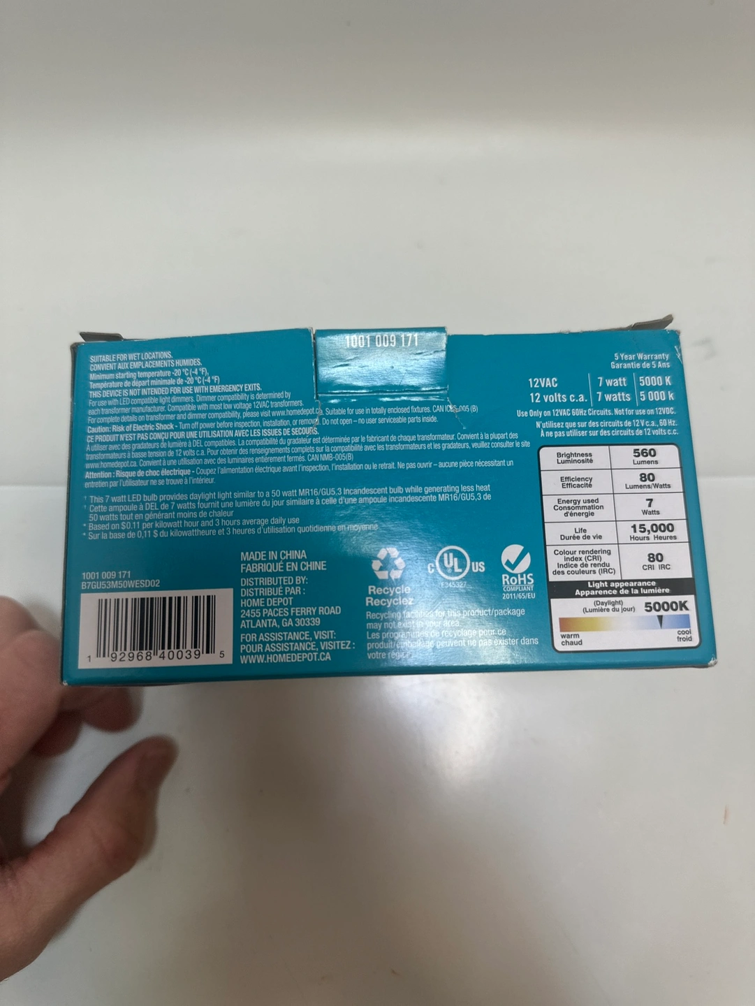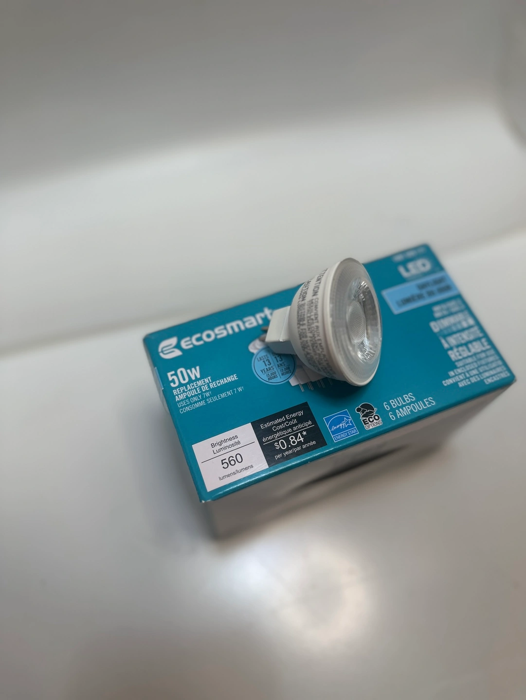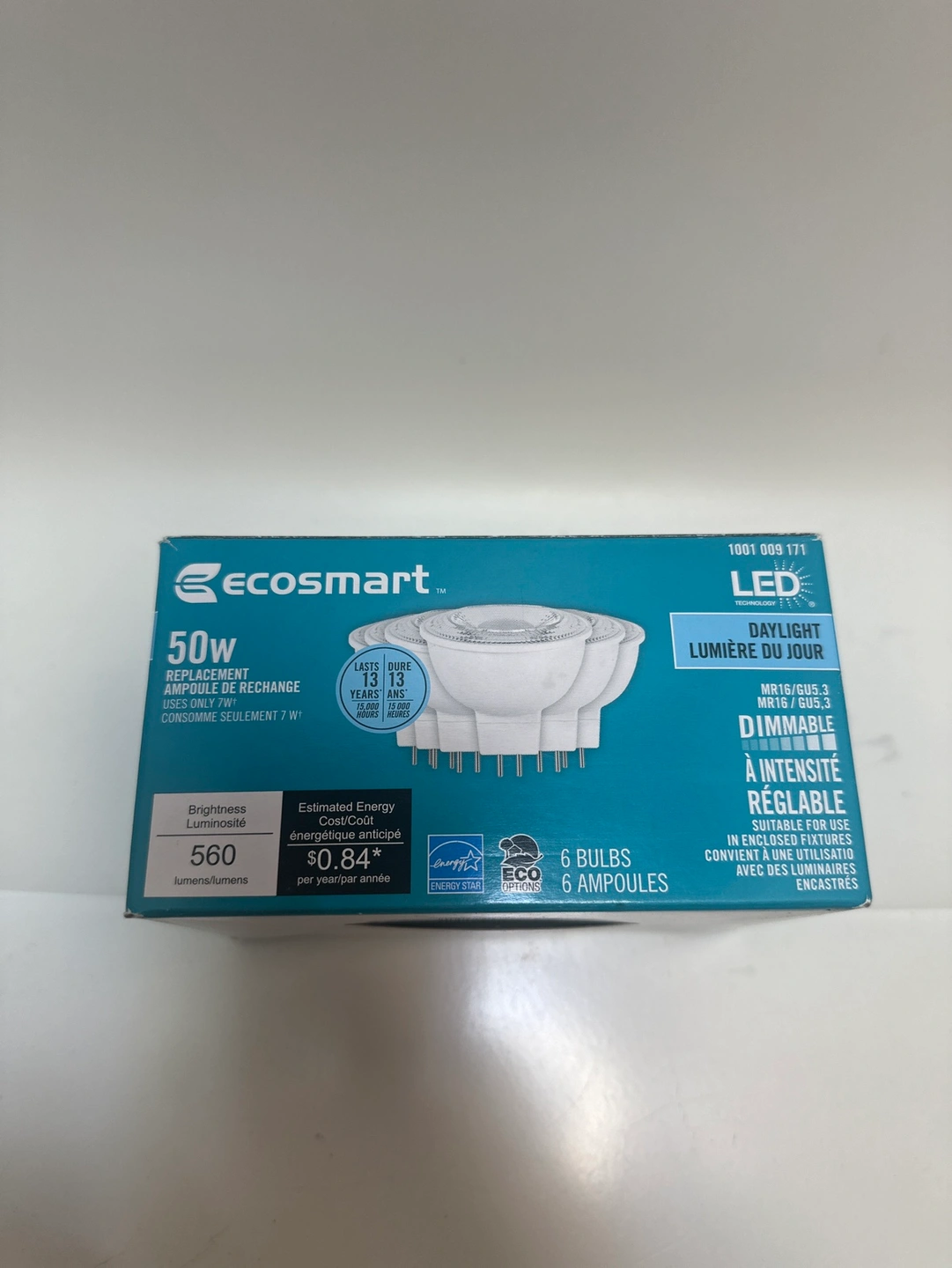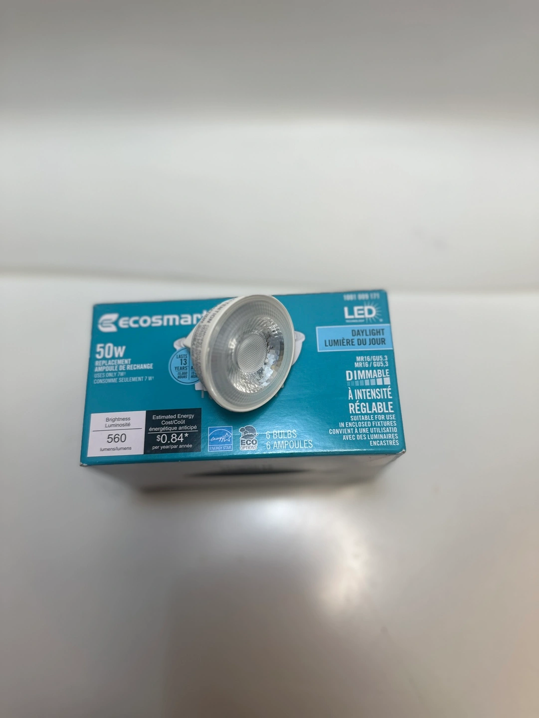 Purchased the wrong bulbs, past the return date at Home Depot. They sell for $41.00 - selling them at 50% off to get them gone. Here’s the store description: The Ecosmart 50W Equivalent Bright White (3000K) MR16j LED Flood Light Bulb (6-Pack) is ideal for both accenting and general room lighting. It is instant-on and will not fade fabrics or furnishings. The LED bulb offers energy savings and long life. It is an energy-efficeint replacement for 50W halogen bulbs. ENERGY STAR® certified.
