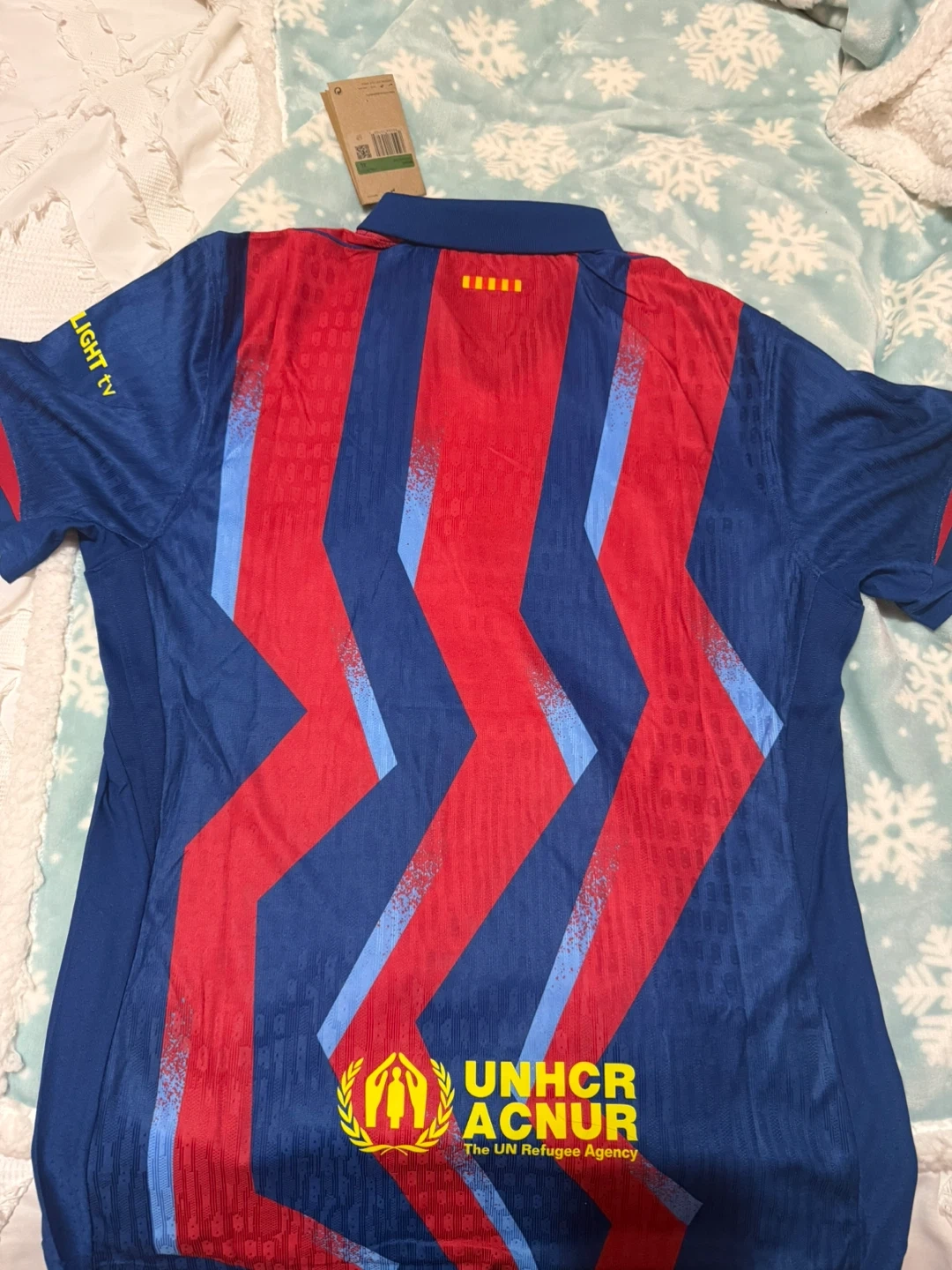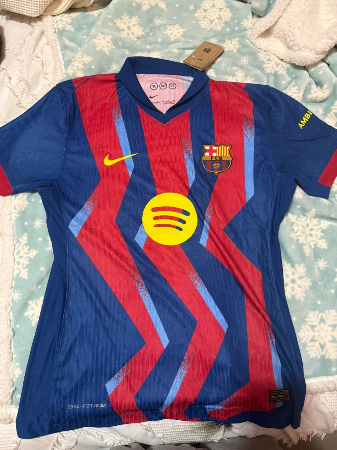 This is the FC Barcelona 2026 special jersey. It's made with Nike's Dri-FIT technology for comfort. The jersey features the club crest and sponsor logos. Size small.