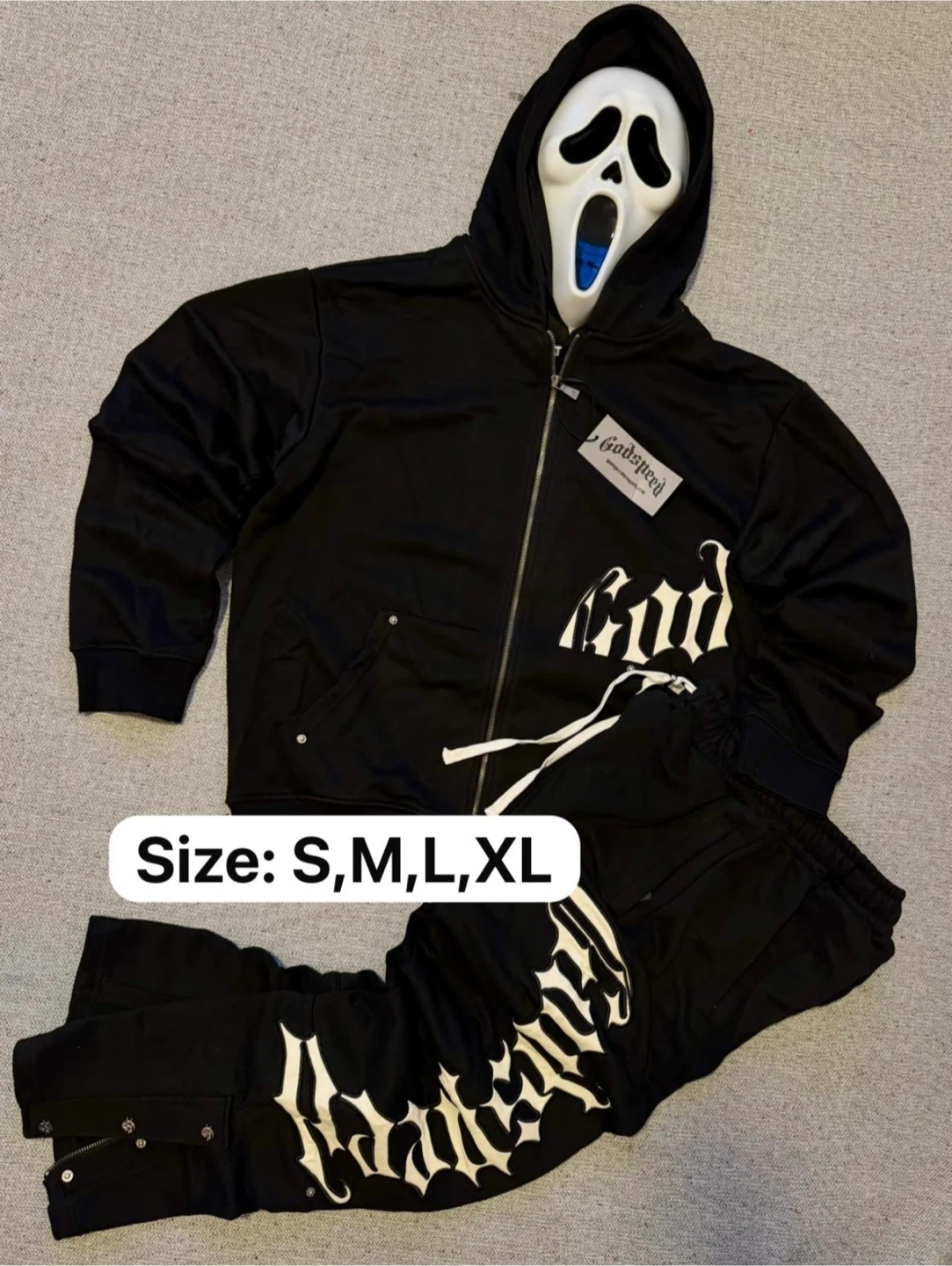 Selling a Godspeed tracksuit in black! It includes a zip-up hoodie and matching pants. Available in sizes S, M, L, and XL