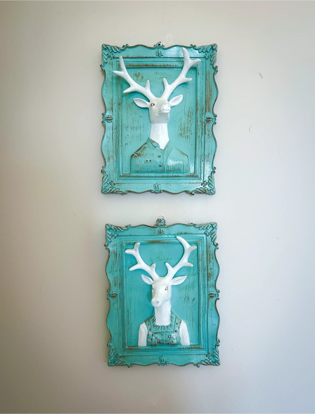 Set of two decorative wall mount art pieces featuring deer heads in ornate turquoise frames. Each deer head is white with prominent antlers and dressed in a vintage-style outfit. The frames have a distressed finish and intricate detailing. These pieces add a whimsical and unique touch to any room!