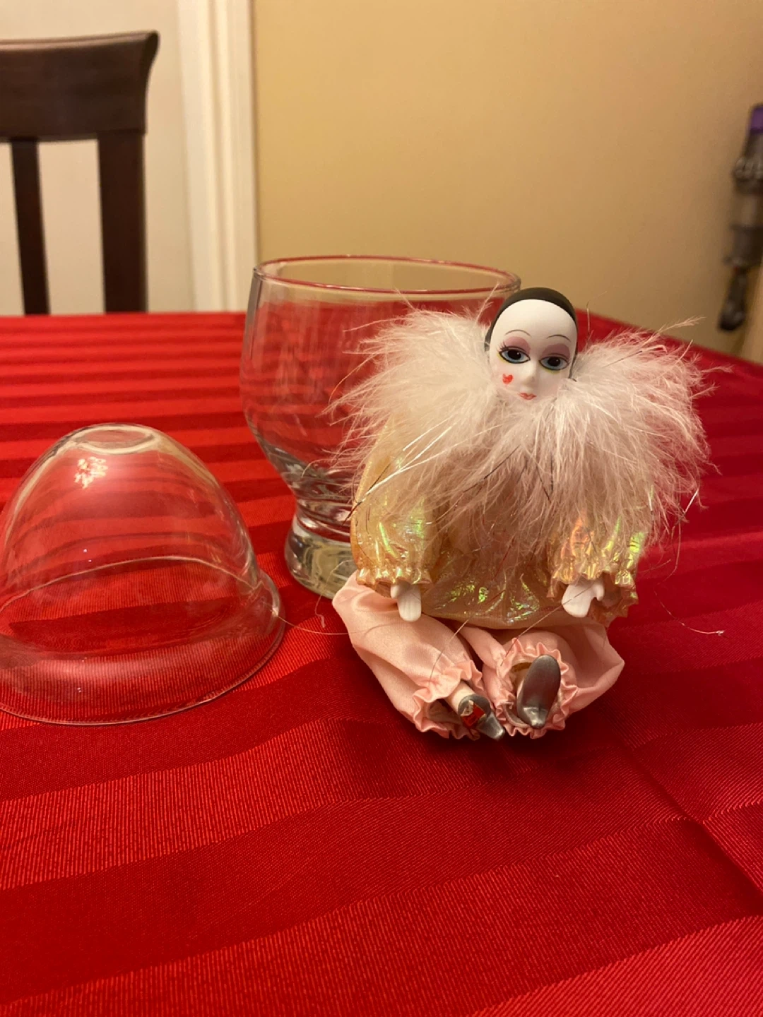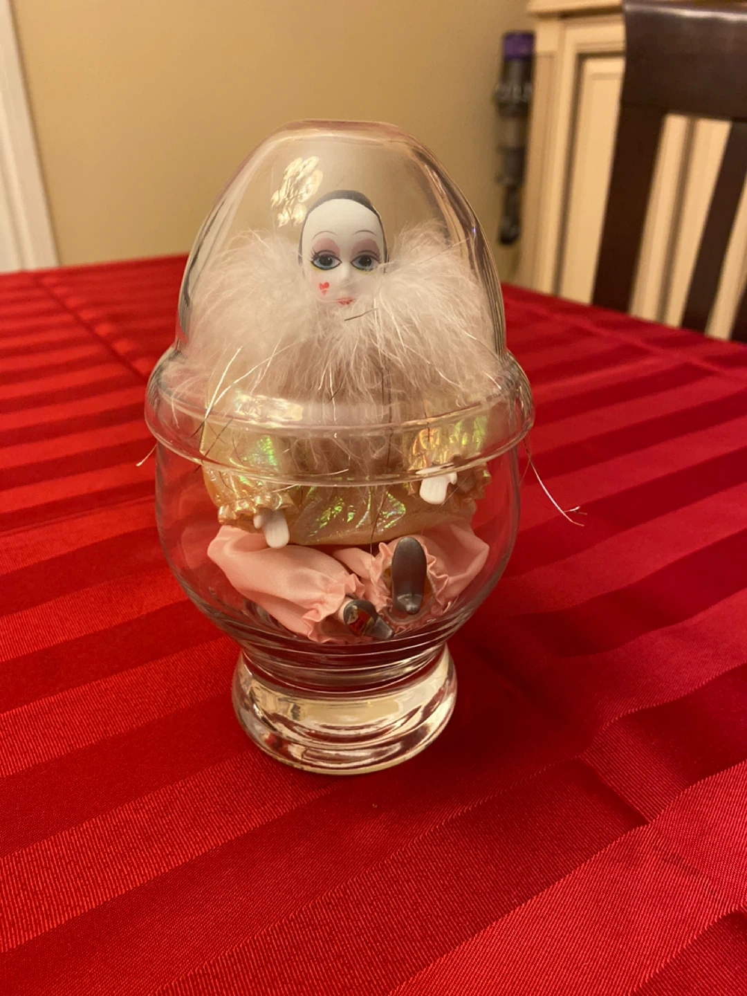This is a decorative clown doll with a fluffy trim. It's dressed in a sparkly top and pink pants. The doll comes with a glass display dome.