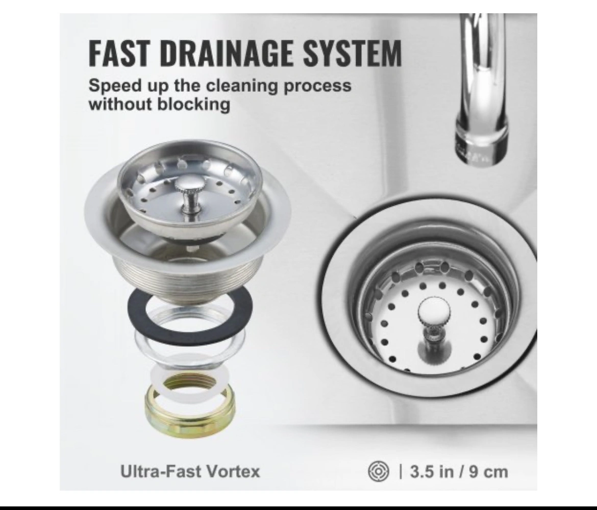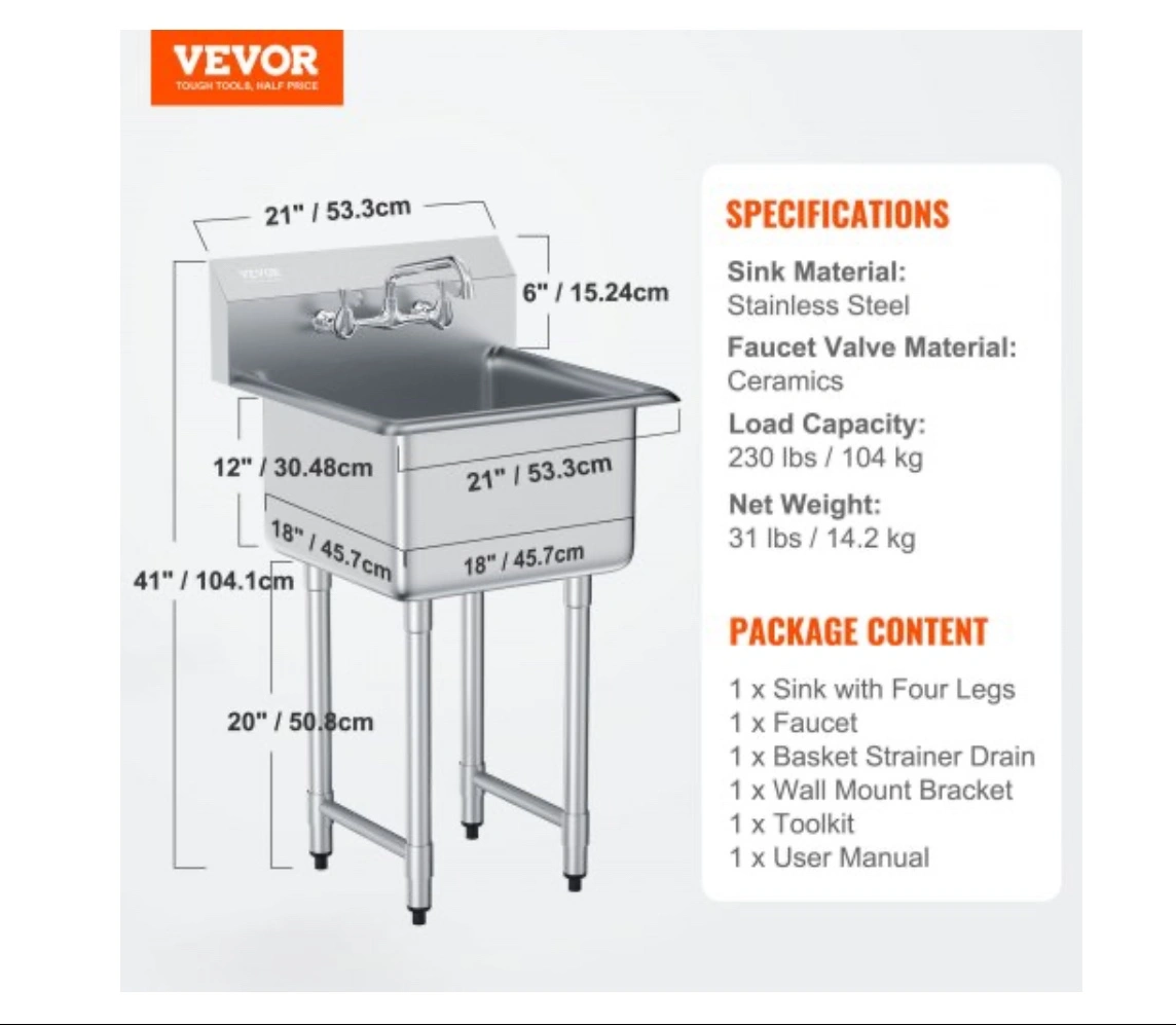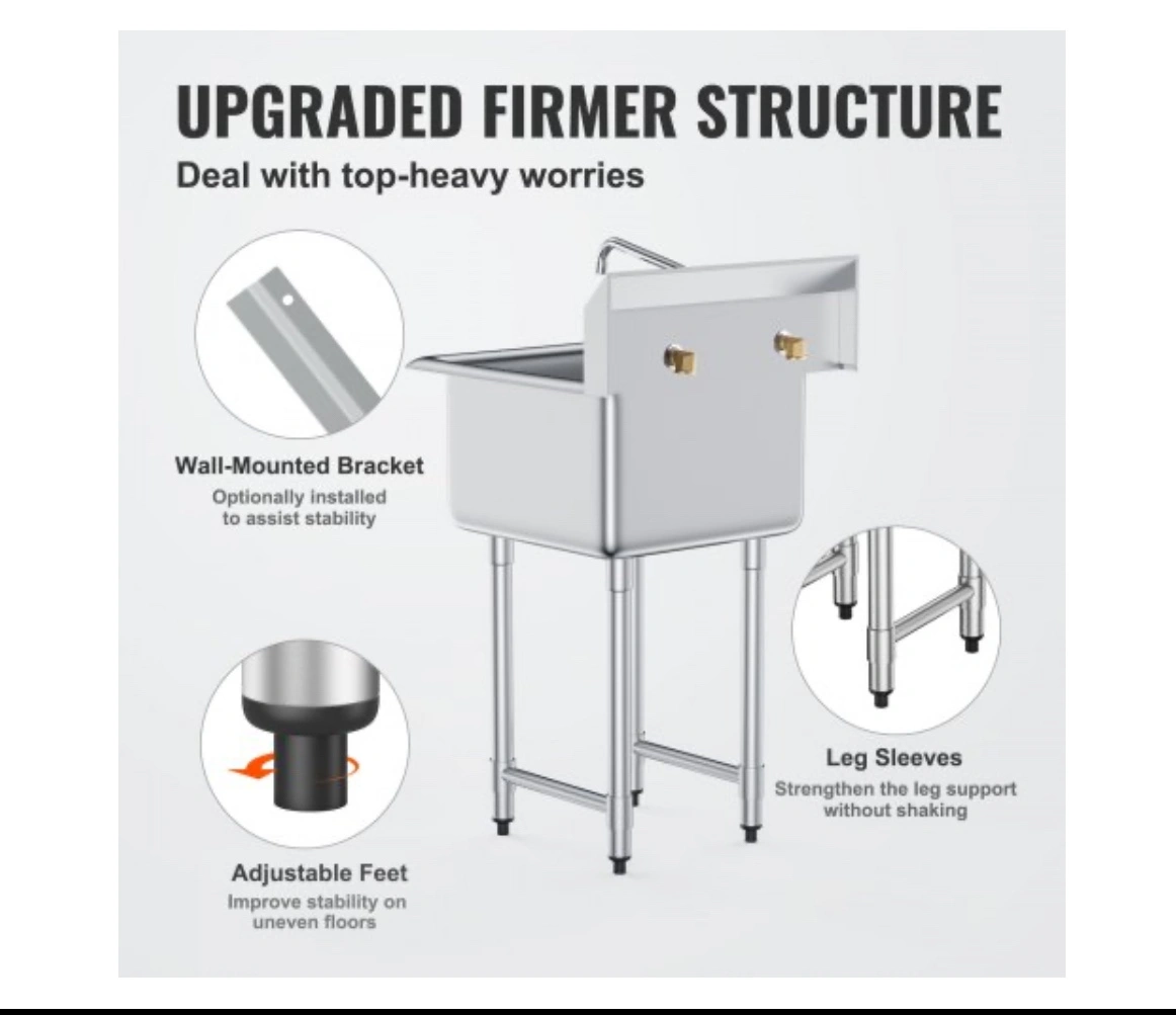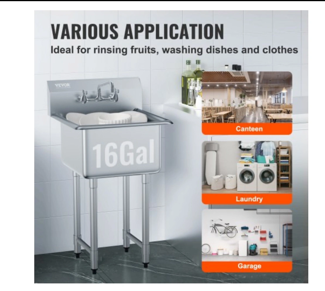 New in box stainless steel prep/utility sink, one compartment free standing sink includes faucet and legs. Great for garage, restaurant, kitchen or laundry.