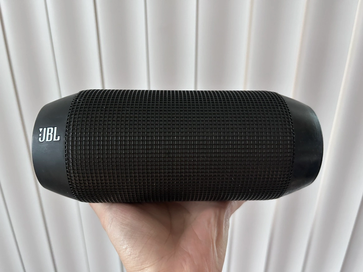 Older model of JBL speakers, it works well but needs to be constantly charged with a micro-USB cord (which is NOT included).