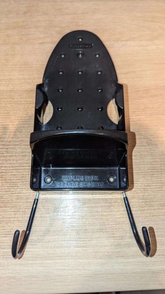 Black iron stand with hooks to hang your ironing board. I am giving it away because my new iron does not fit.