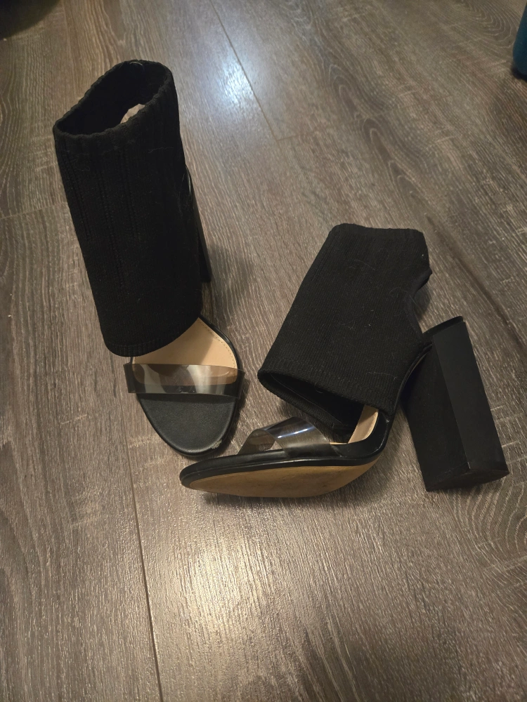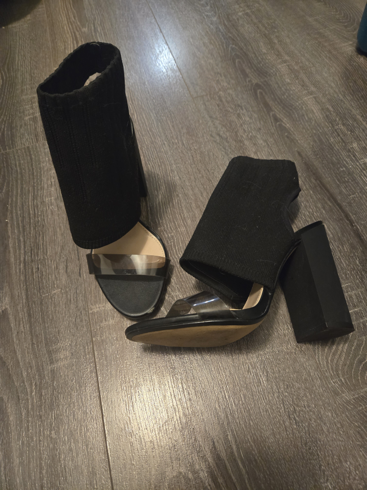 These are black heeled sandals with a knit upper. They have a chunky heel. The strap is clear plastic.