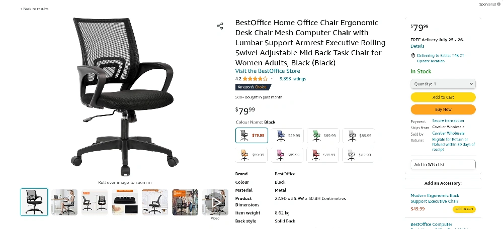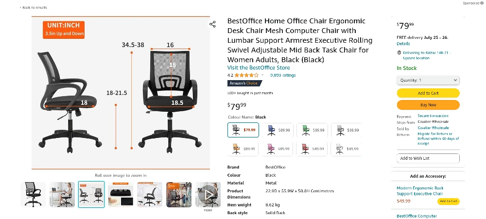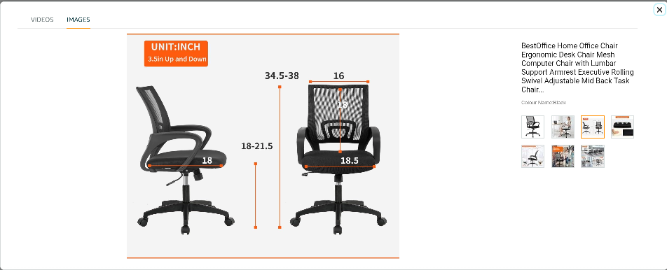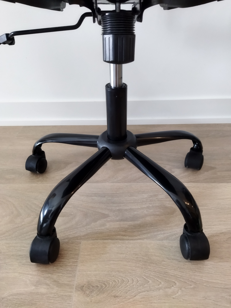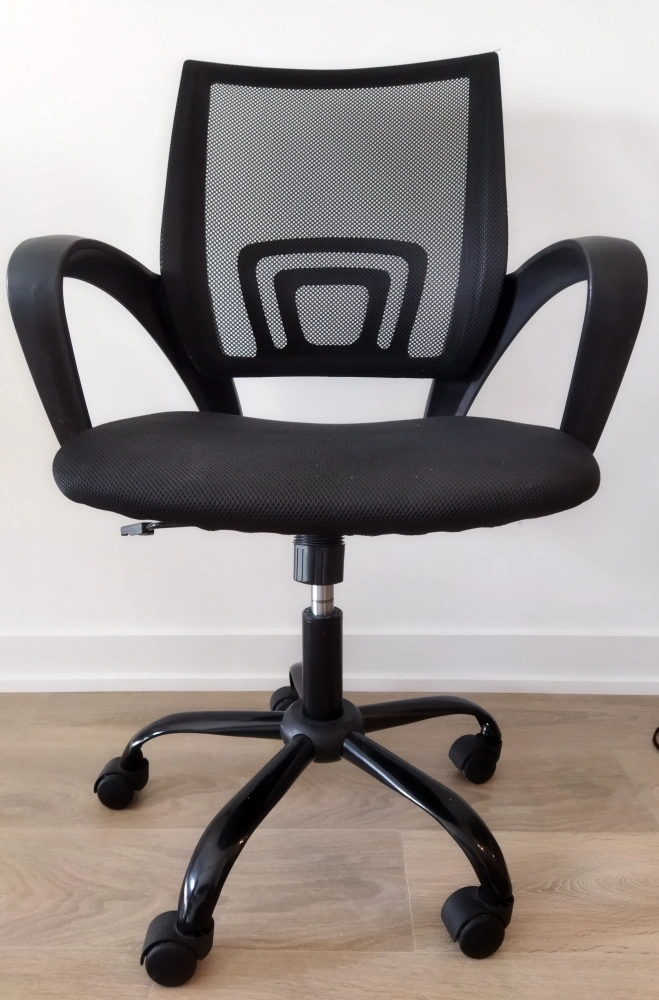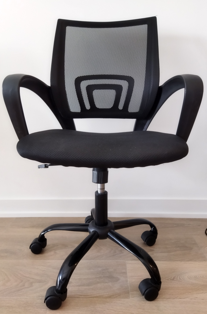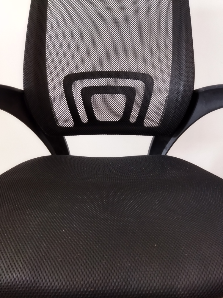 This chair has a black mesh back with a black fabric seat. It also features a height adjustable seat and five caster wheels.