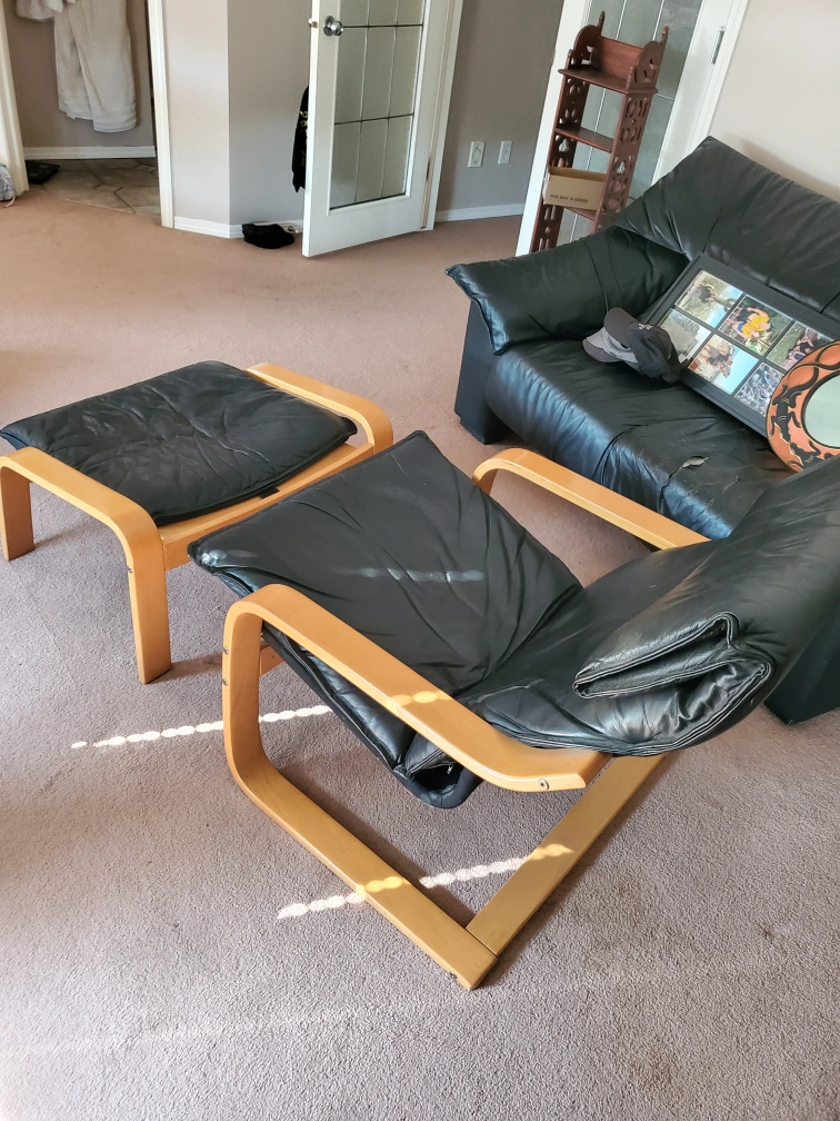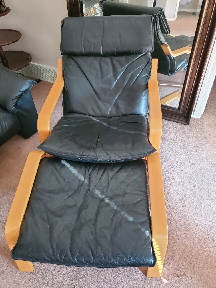 Black leather recliner with a matching ottoman. The chair and ottoman are made of wood with a black leather covering. The chair has a headrest.