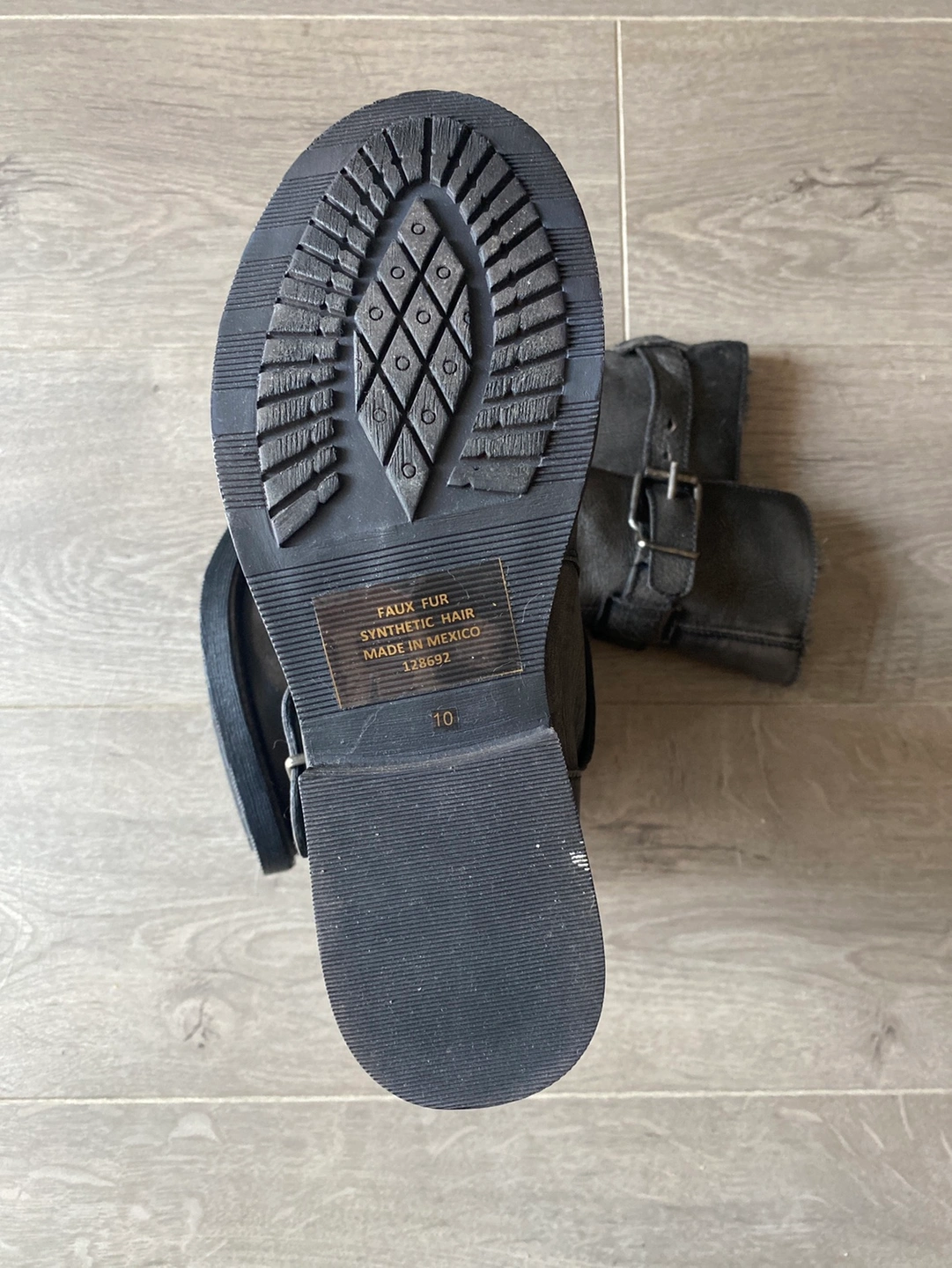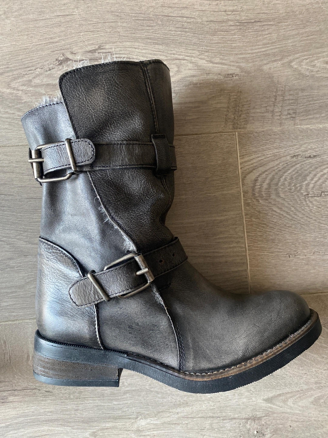 Grey/taupe boots with buckle details. Faux fur lined. They are in excellent condition- never worn. (Wrong size for me)