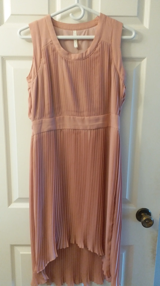 Pink pleated dress with a high-low hemline. It has a round neckline and is sleeveless. It is made of a lightweight fabric, zipper is on the side.