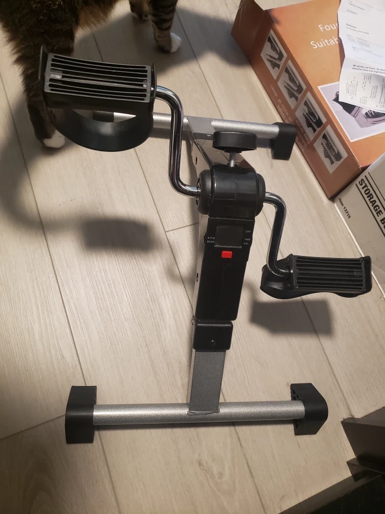 This exercise machine has 2 pedals, which can be used for exercising arms or legs. Fits easily under a desk for use while on a computer or on a couch. Resistance can be increased by turning a knob. Includes an LED screen showing time, steps, and calories burned.