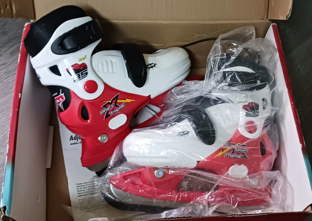 A pair of inline skates for kids. The skates are adjustable and come in a size 1. They are red, white and black. They include a box and all original packaging.