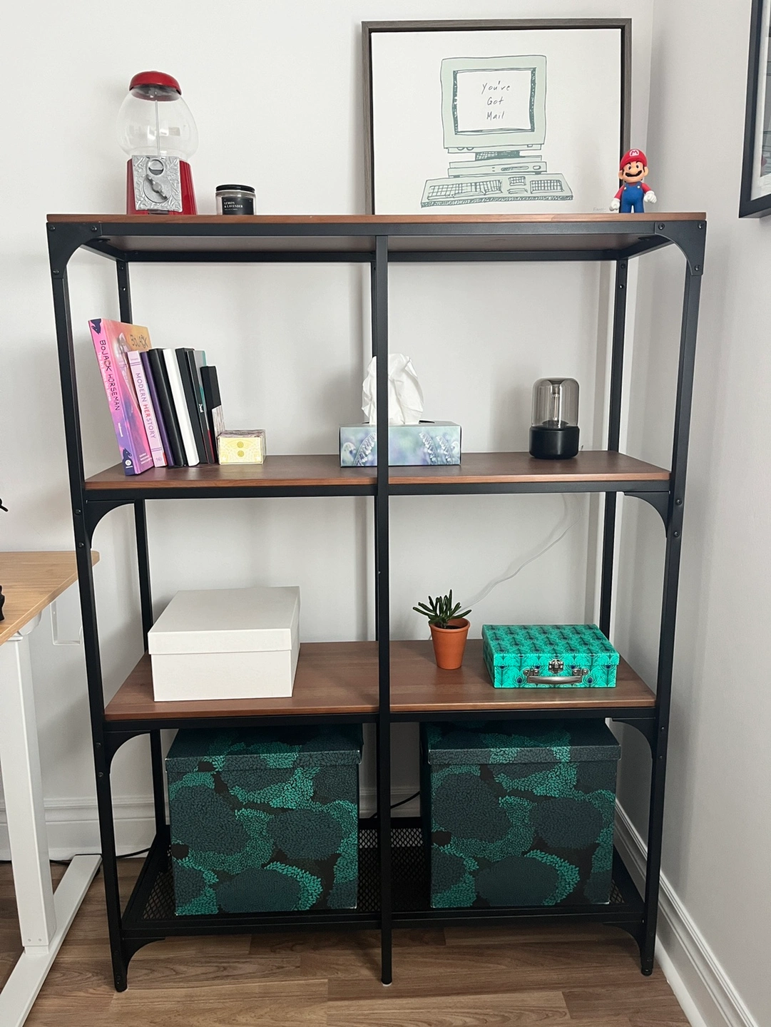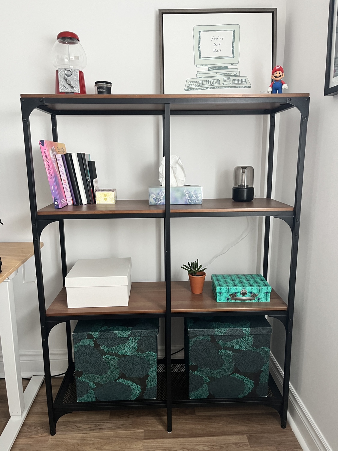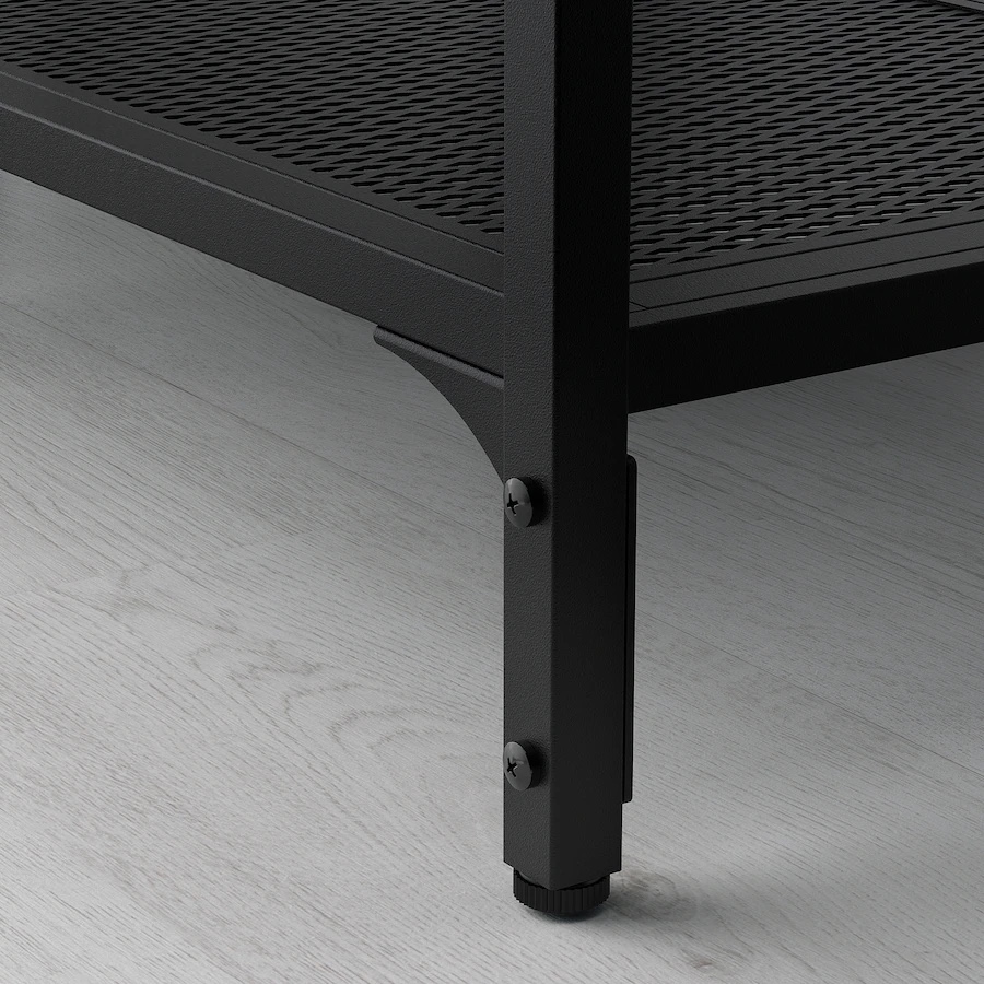 Like new black metal and wood Ikea shelf unit. Adjustable feet.