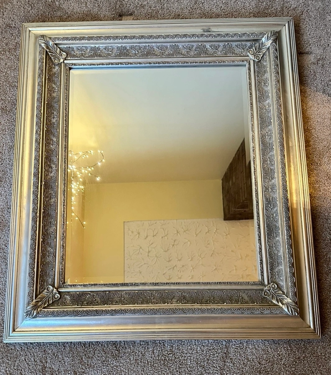 ๐ Like new LARGE ornate mirror with a silver WOOD frame. It is almost rectangular (aprox. 34"x30") in shape and has a detailed design around the frame.