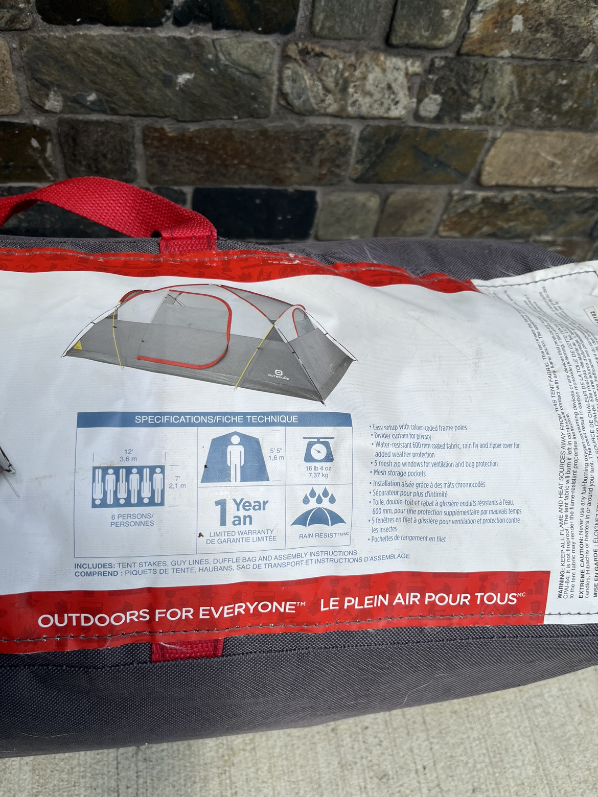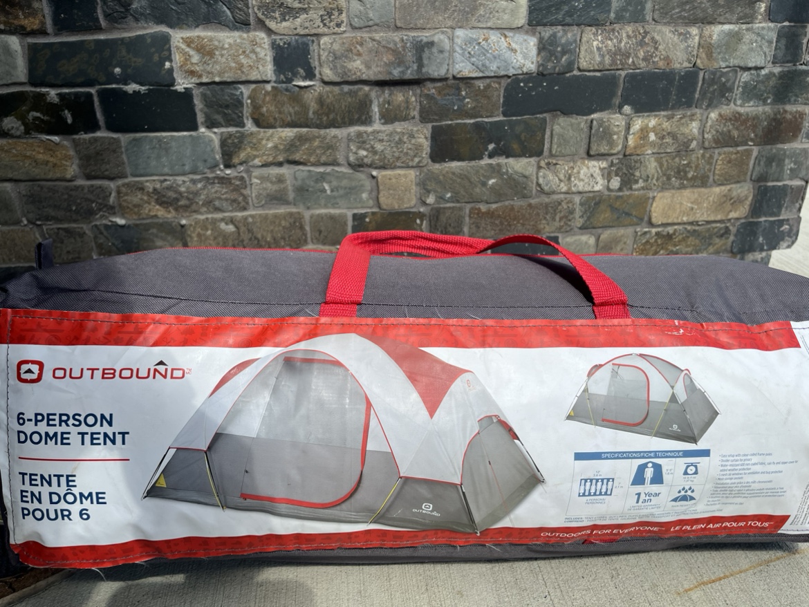 This is a 6-person dome tent by Outbound. It is in the original packaging, and includes the tent, tent stakes, guy lines, a duffel bag, and assembly instructions.