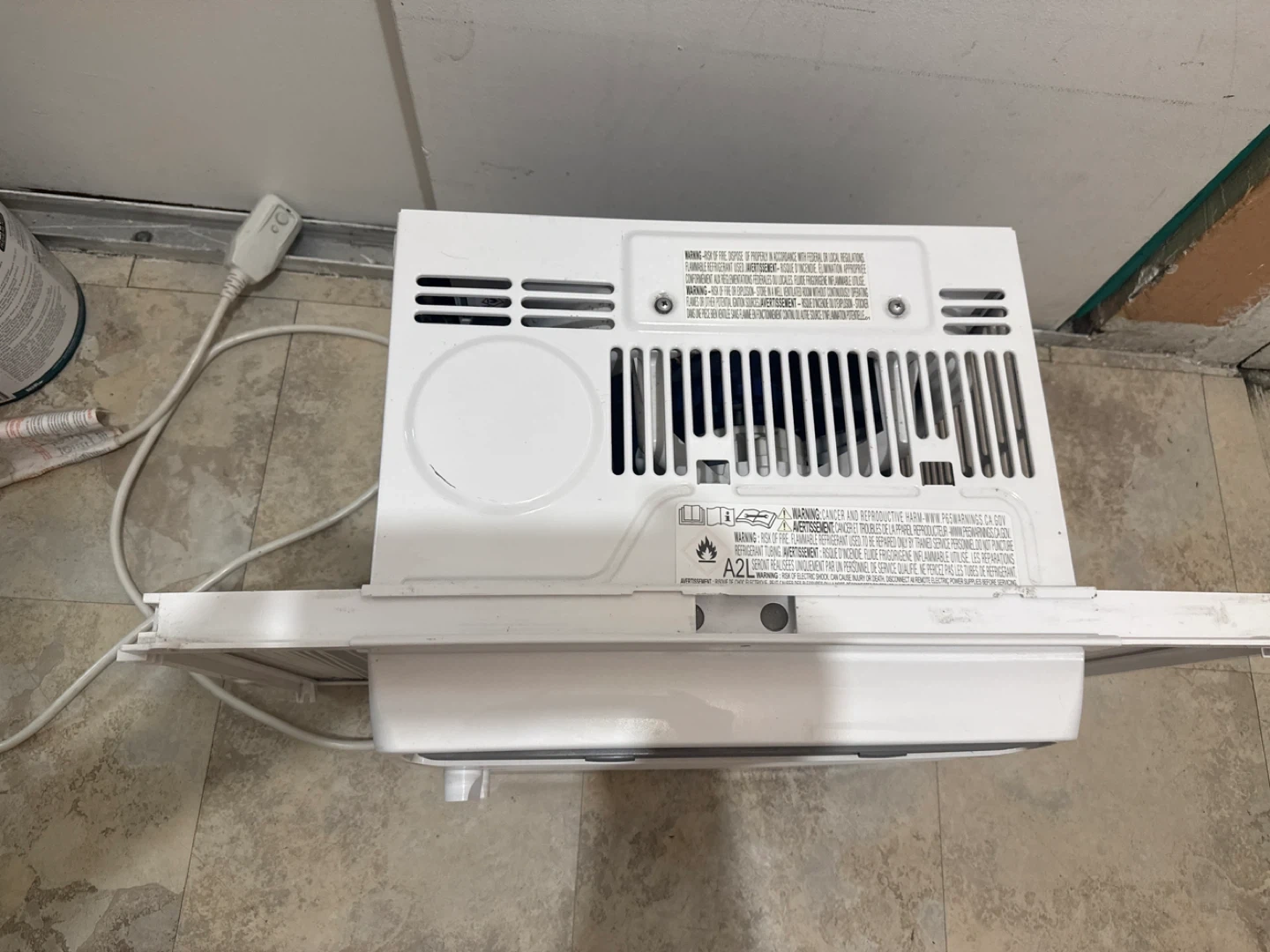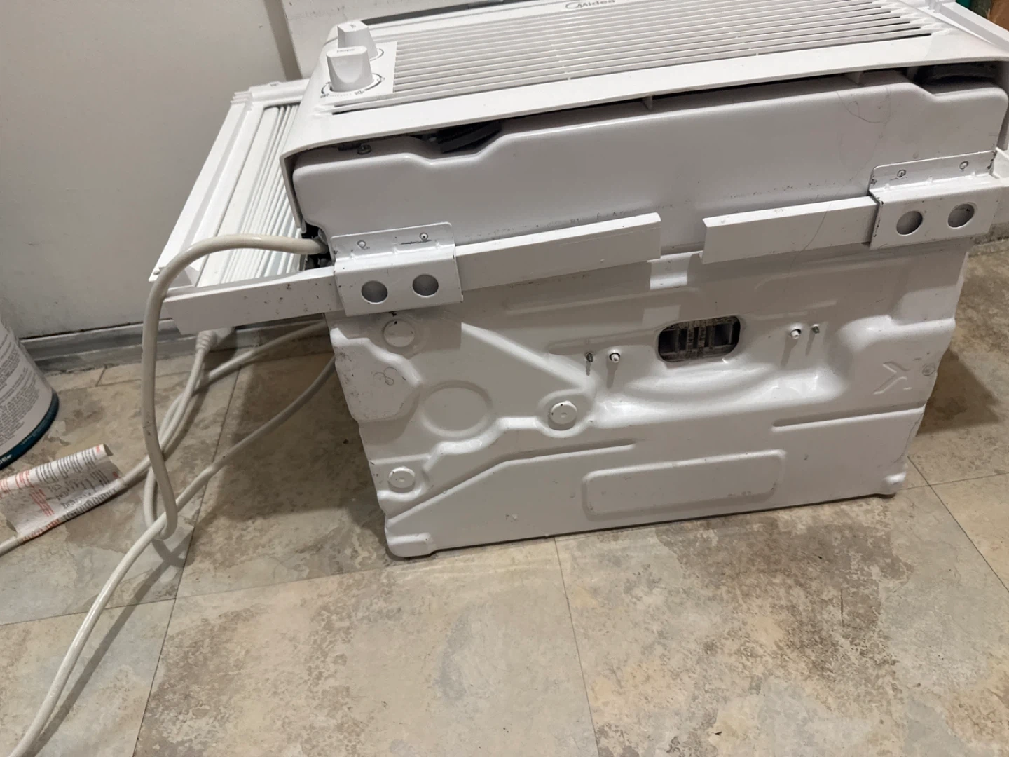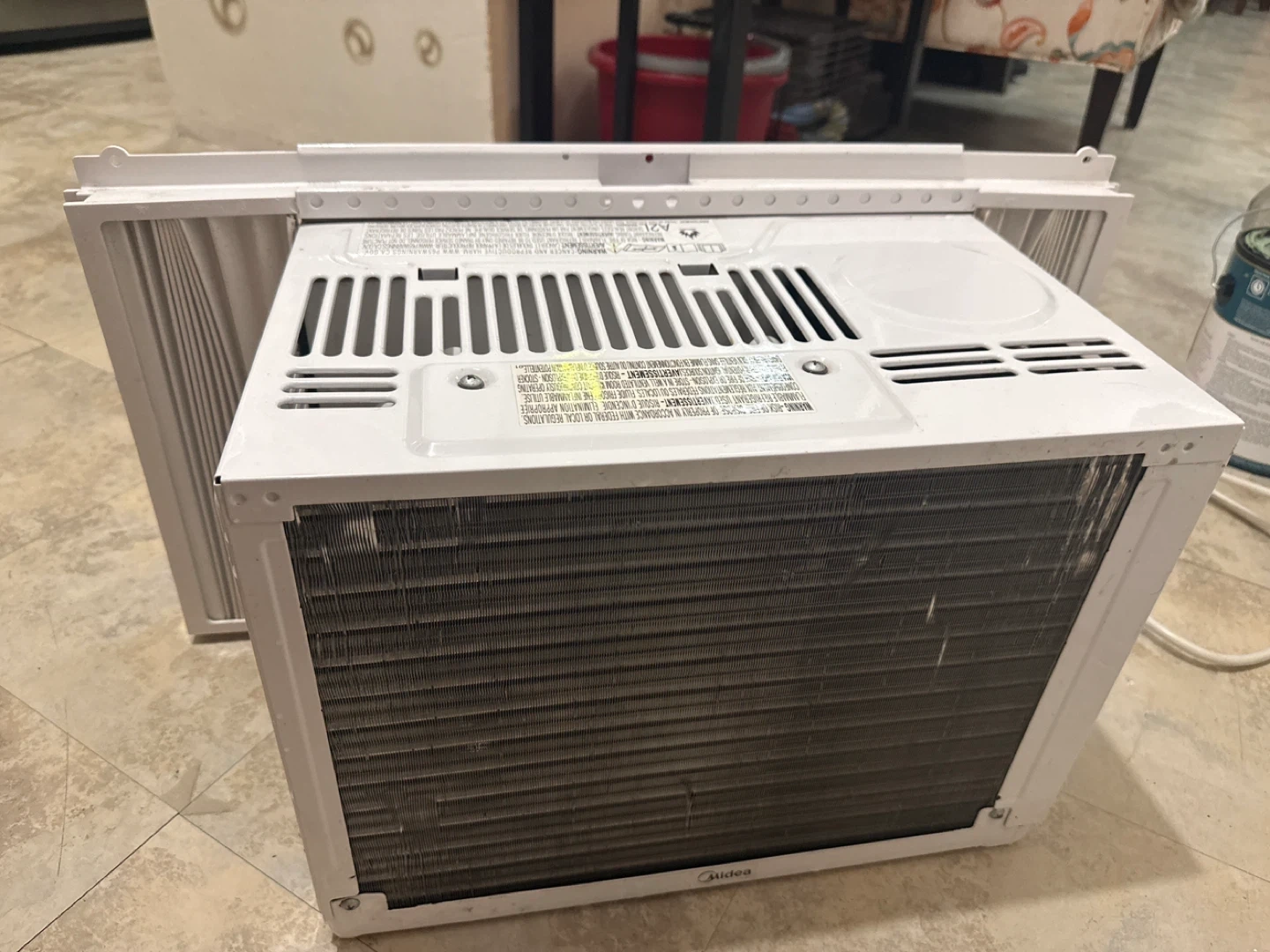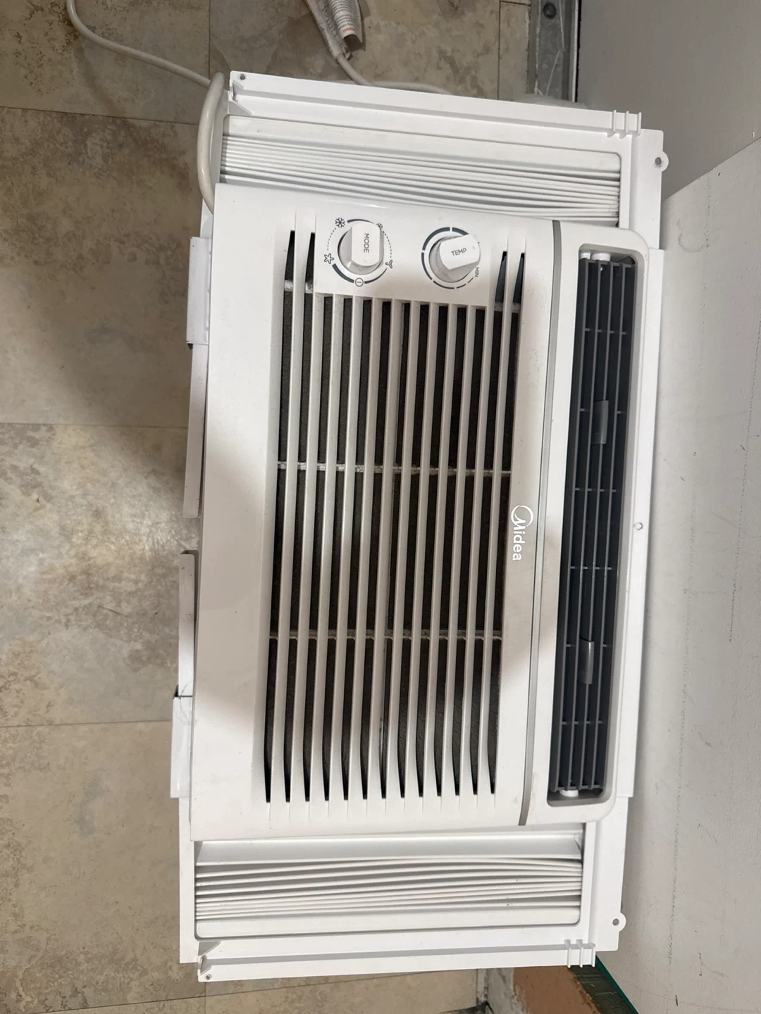 This is a Midea window air conditioner 5000 BTU. It's white and includes the frame for installation. Perfect for cooling down a room!