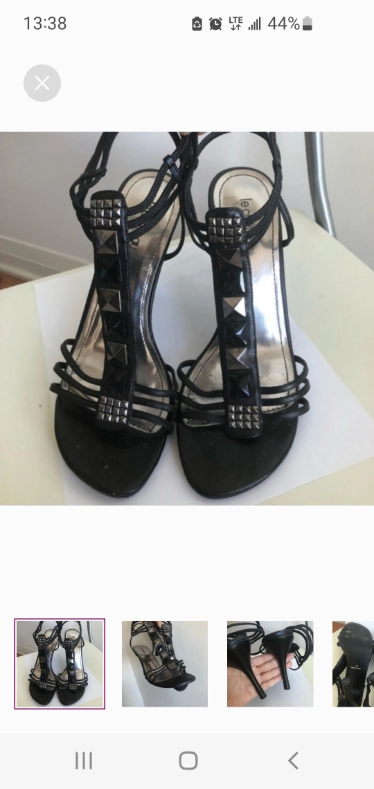 Black heels with silver embellishments. They are a size 8. They have a thin stiletto heel. The straps are adjustable. They have a peep toe.