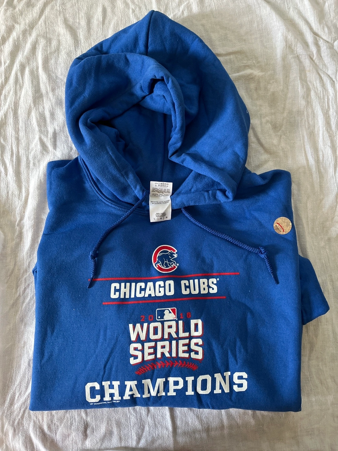Blue hoodie with the Chicago Cubs logo and "2016 World Series Champions" printed on the front. NEW. Never worn