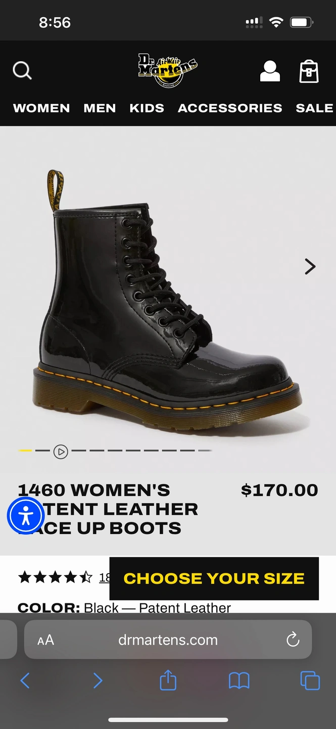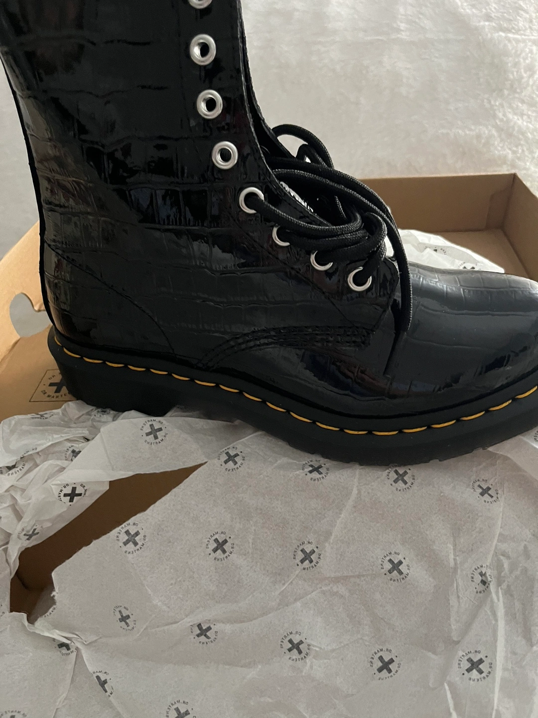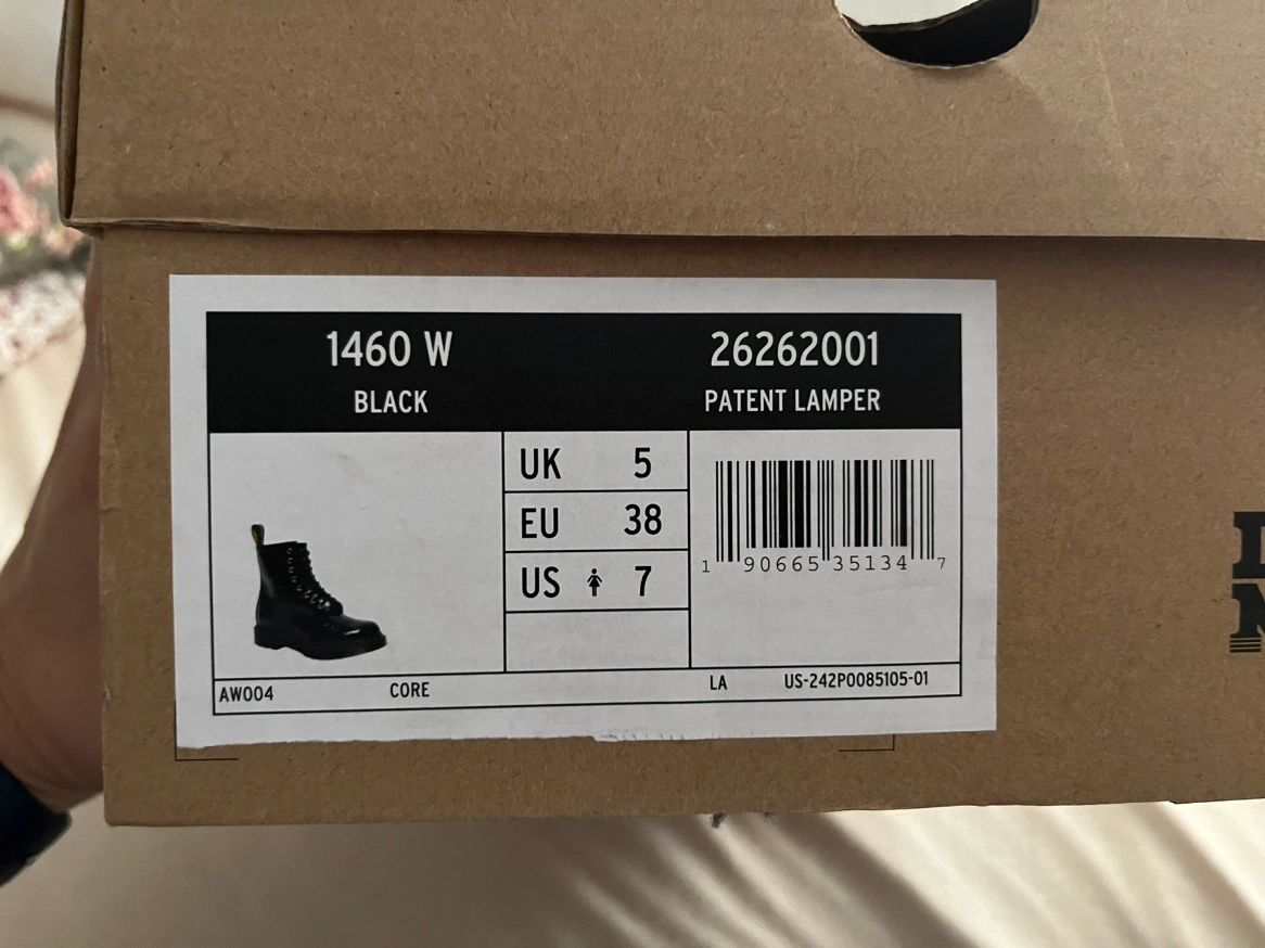 Women's Dr. Martens 1460 boots in size 7 US, black patent leather. The boots are in the original box.