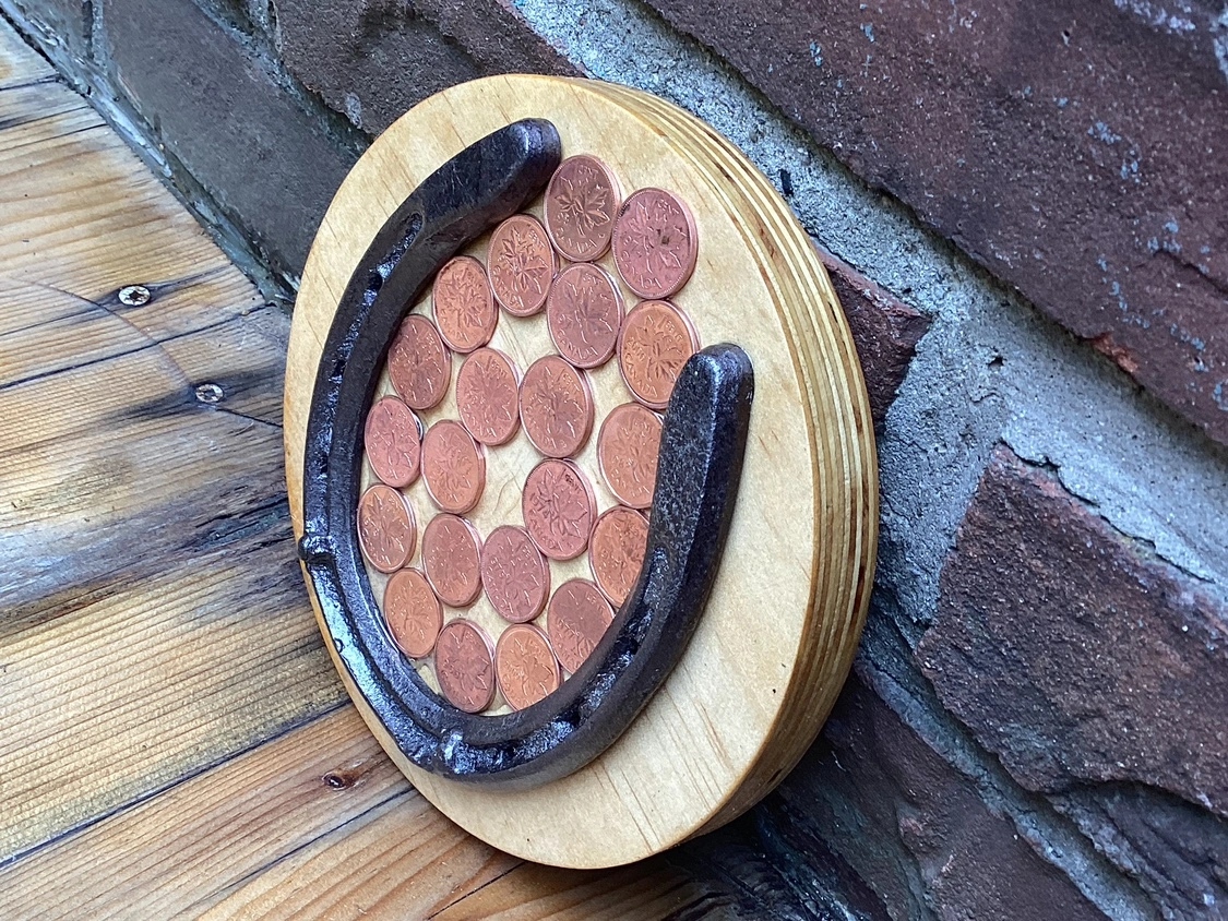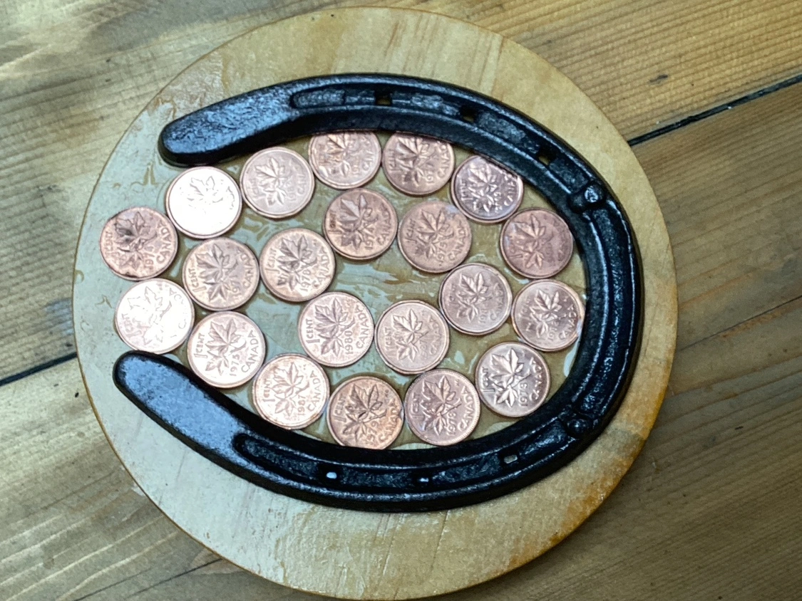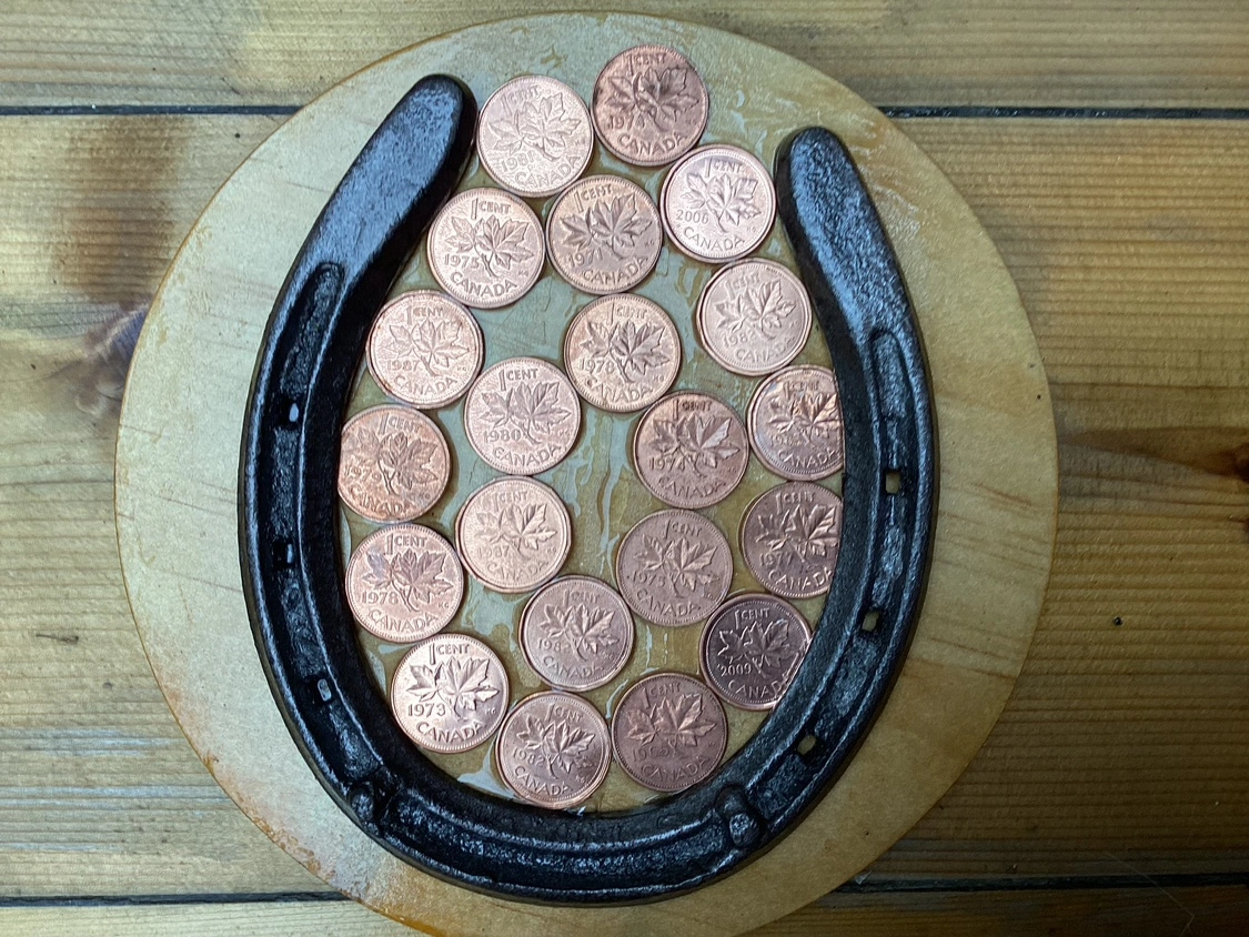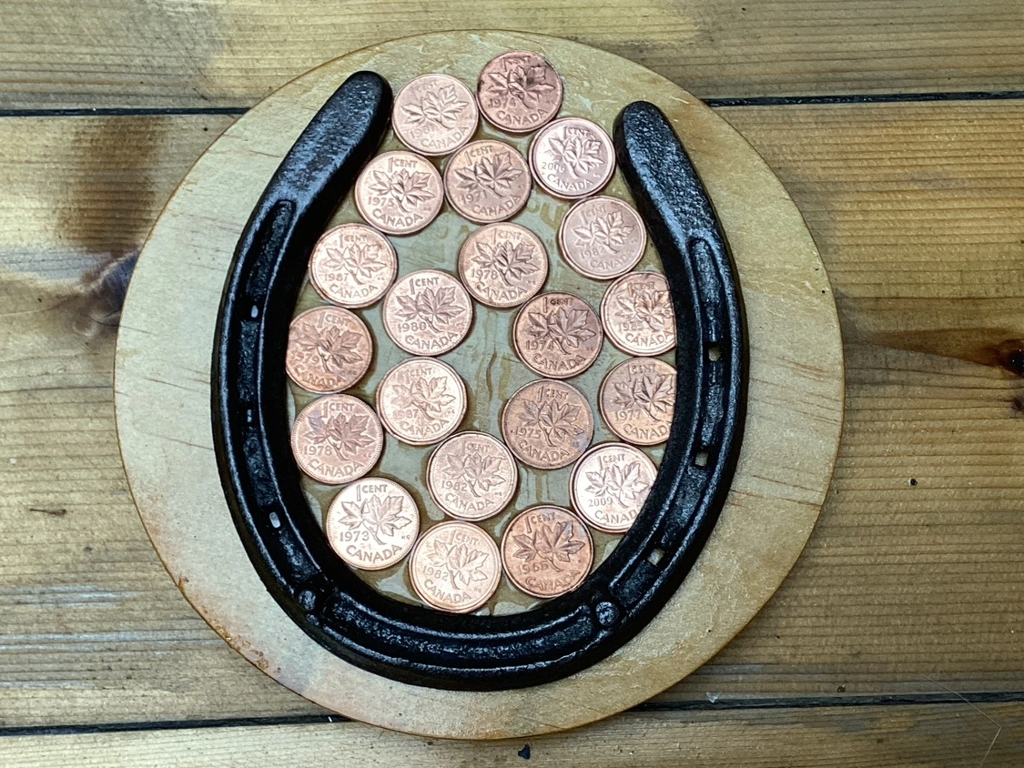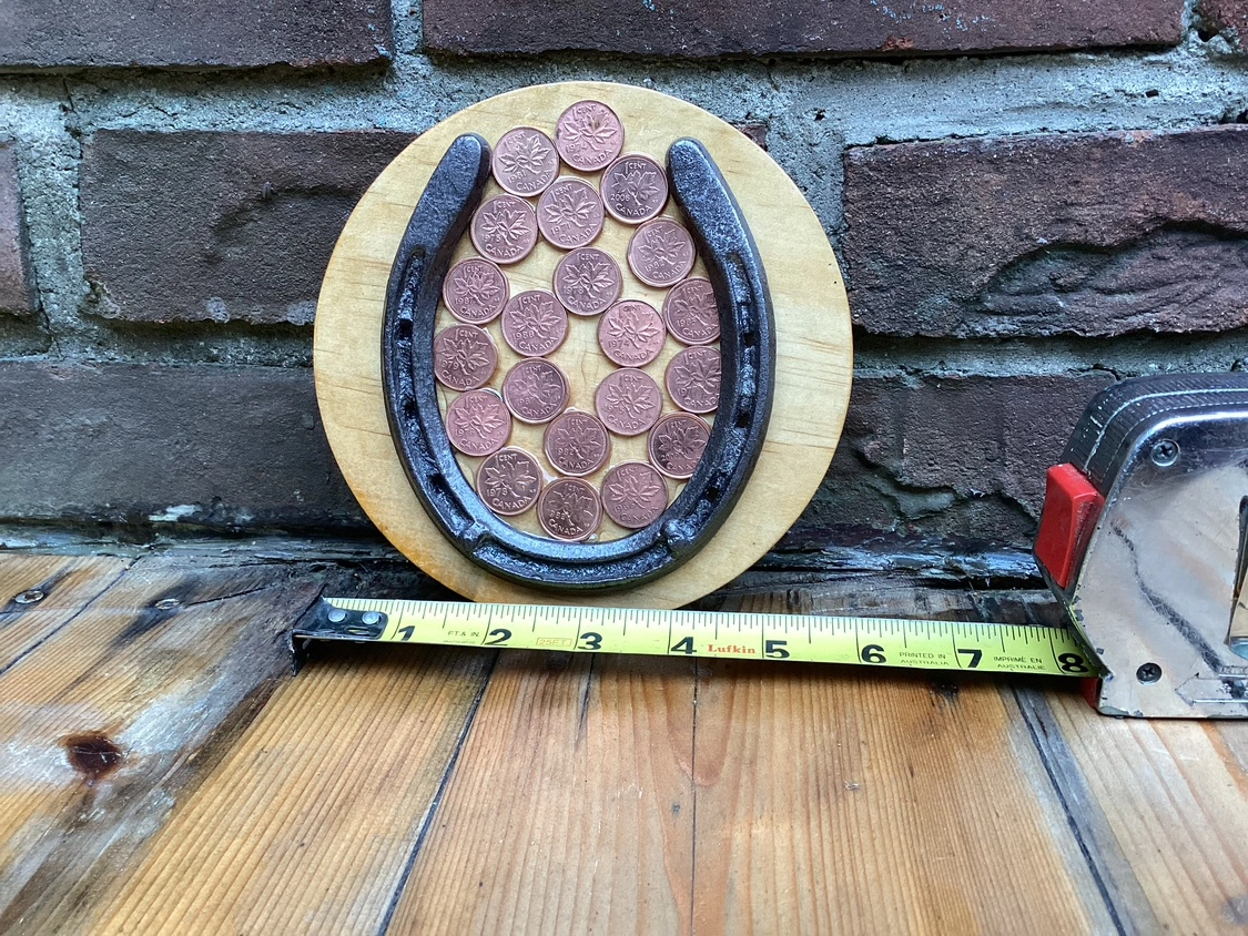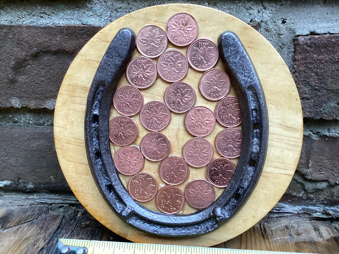 Antique horse shoe with CANADIAN pennies on wood Deco !