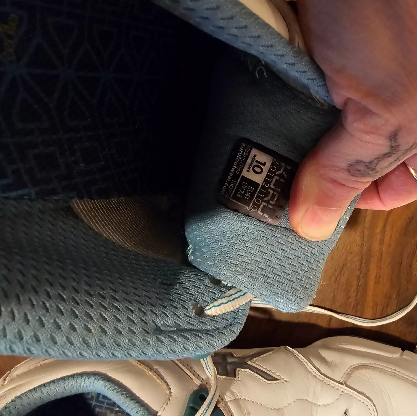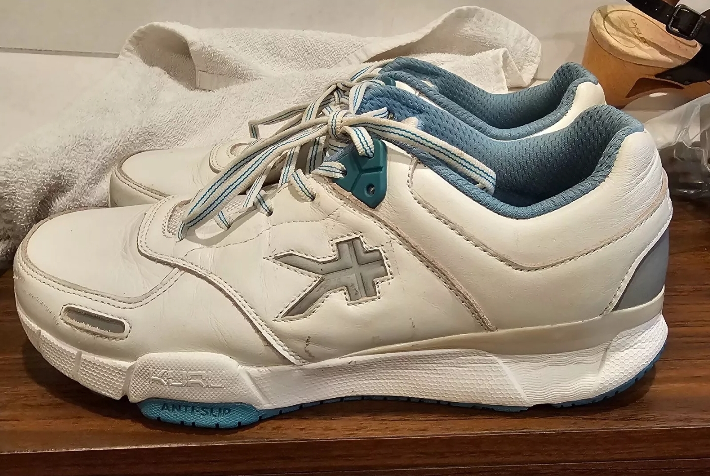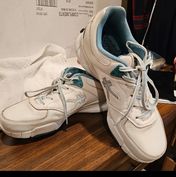 White leather running shoes with teal accents. Lace-up closure. The shoes are in good condition with some wear. size 10 womens