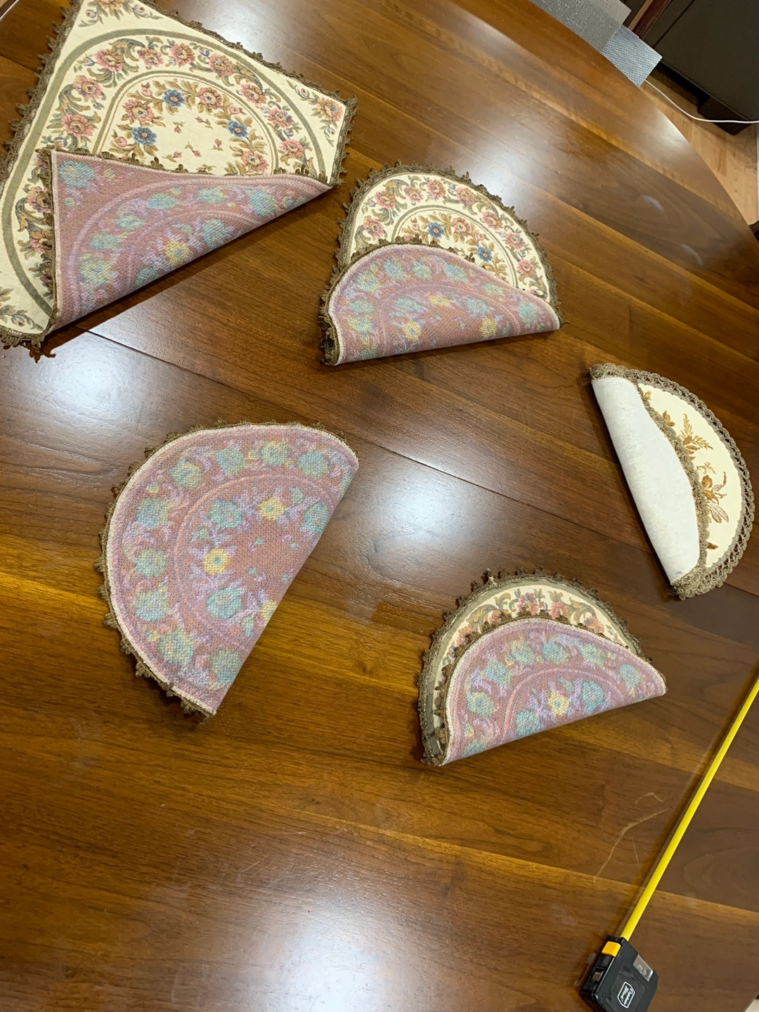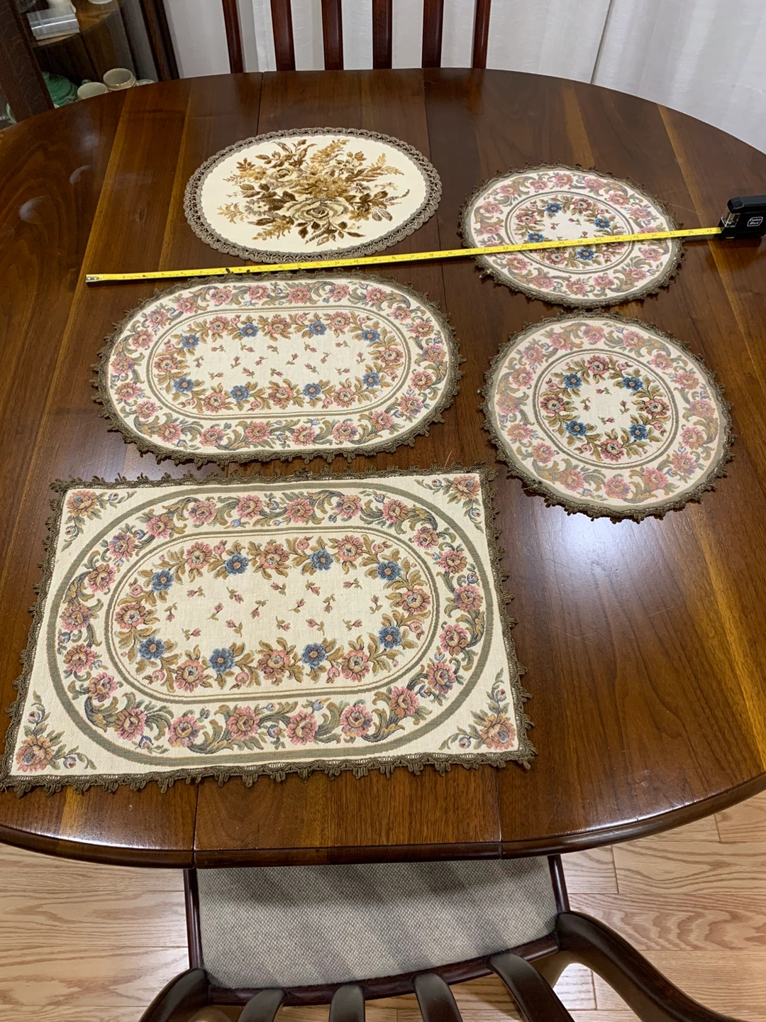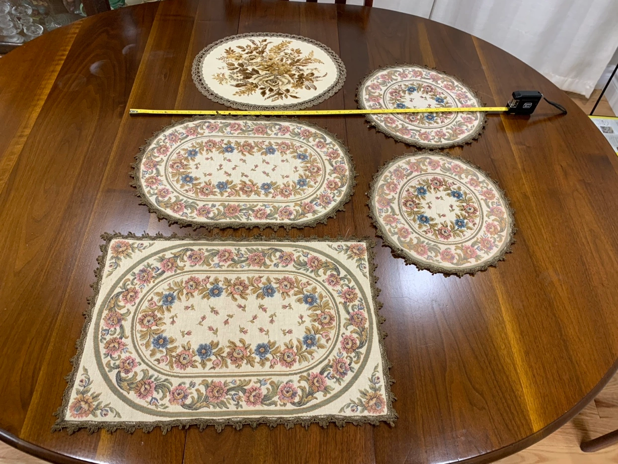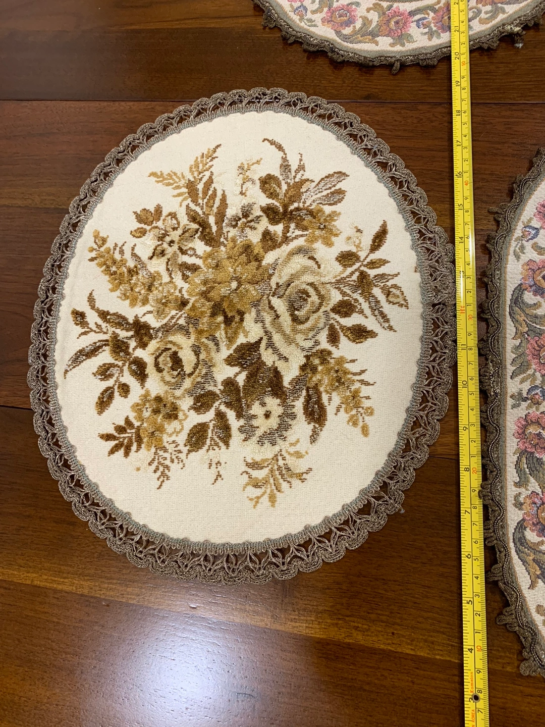 Add a touch of vintage beauty to your home decor with this set of 4 matching Victorian-style doilies plus a unique earth tone floral patterned doily. Made of floral-patterned tapestry material and adorned with delicate embroidery, these doilies are perfect for all occasions. With an antique charm from Belgium, these doilies will enhance the aesthetic of any room. Ideal for collectors and those who appreciate quality linens and textiles, this set of doilies is a must-have for any home. Elevate your home decor and add a touch of elegance with these timeless vintage doilies. Largest measures 19” by 13” and smallest measures 12” round. Great vintage condition. Pink and blue flowers with beautiful greenery. Trimmed in greenish brown edging.