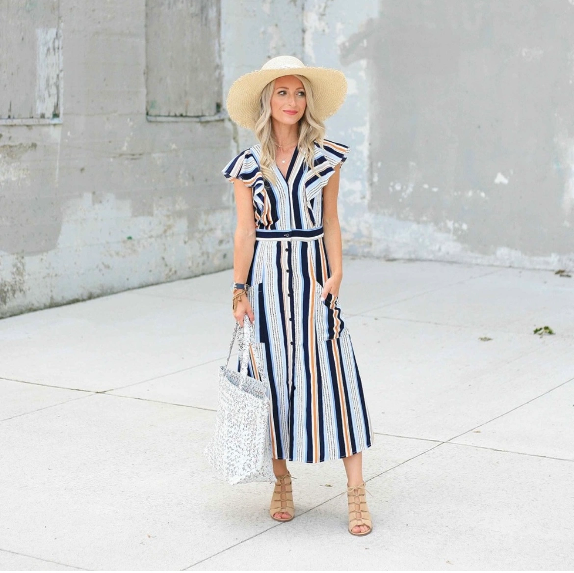 A navy, white, and brown striped maxi dress with ruffle sleeves. The dress has a button-up front and a tie waist. It has pockets on either side.