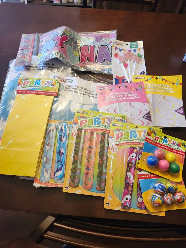 party decoations. includes 1 pack of loot bags. 1 birthday banner, star candles, two tassles garlands(1 pink, 1 yelllow) 2 swirls decorations(1 pink, 1 yellow) slap bracalets and bousing balls. purchased for a birthday party but never used them. pick up only