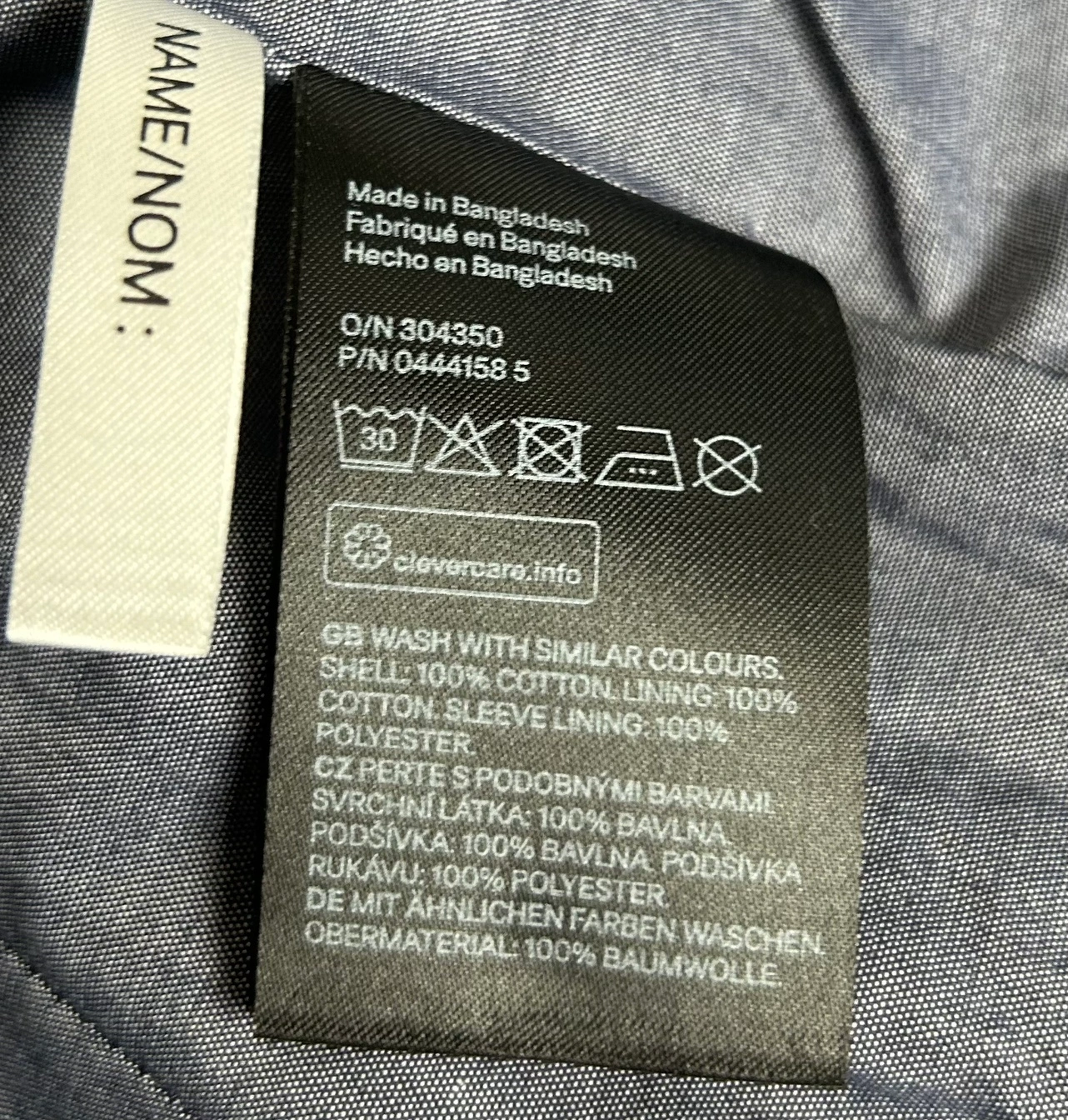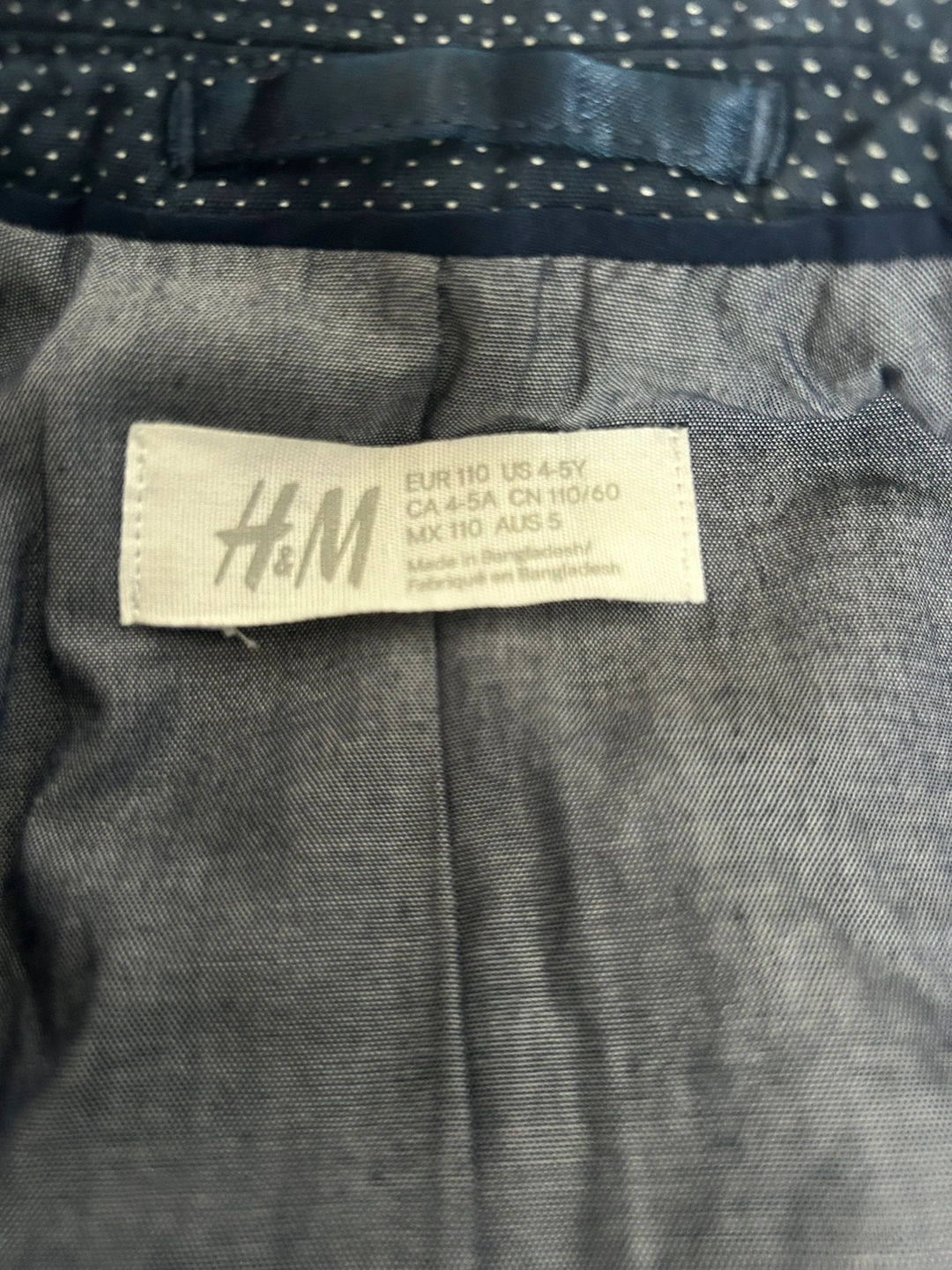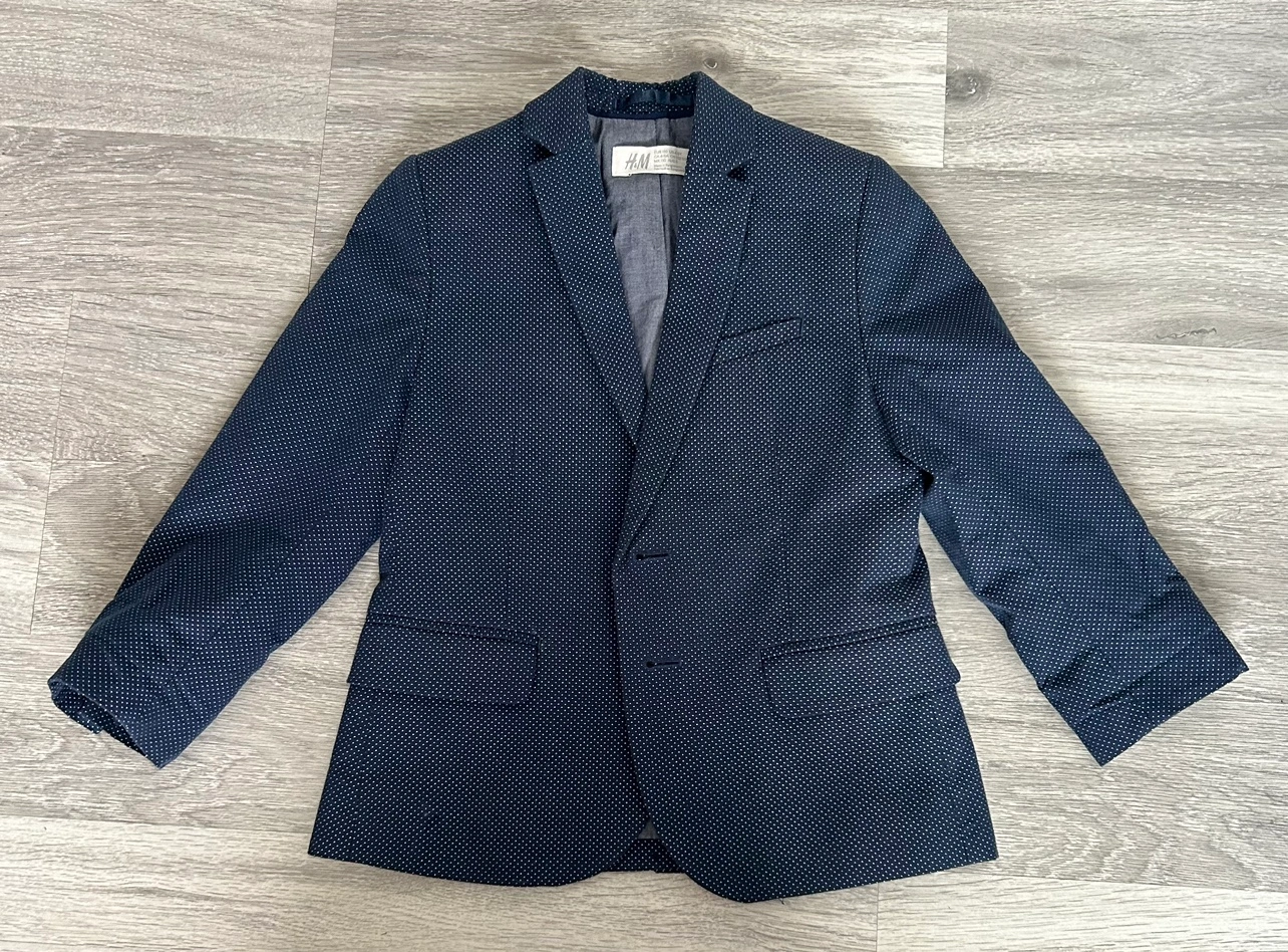 Blue blazer with a white polka dot pattern. The blazer is lined in a cotton fabric. There are two button pockets on the front of the blazer and two interior pockets on the inside. The blazer has a single button closure. The blazer is in good condition.