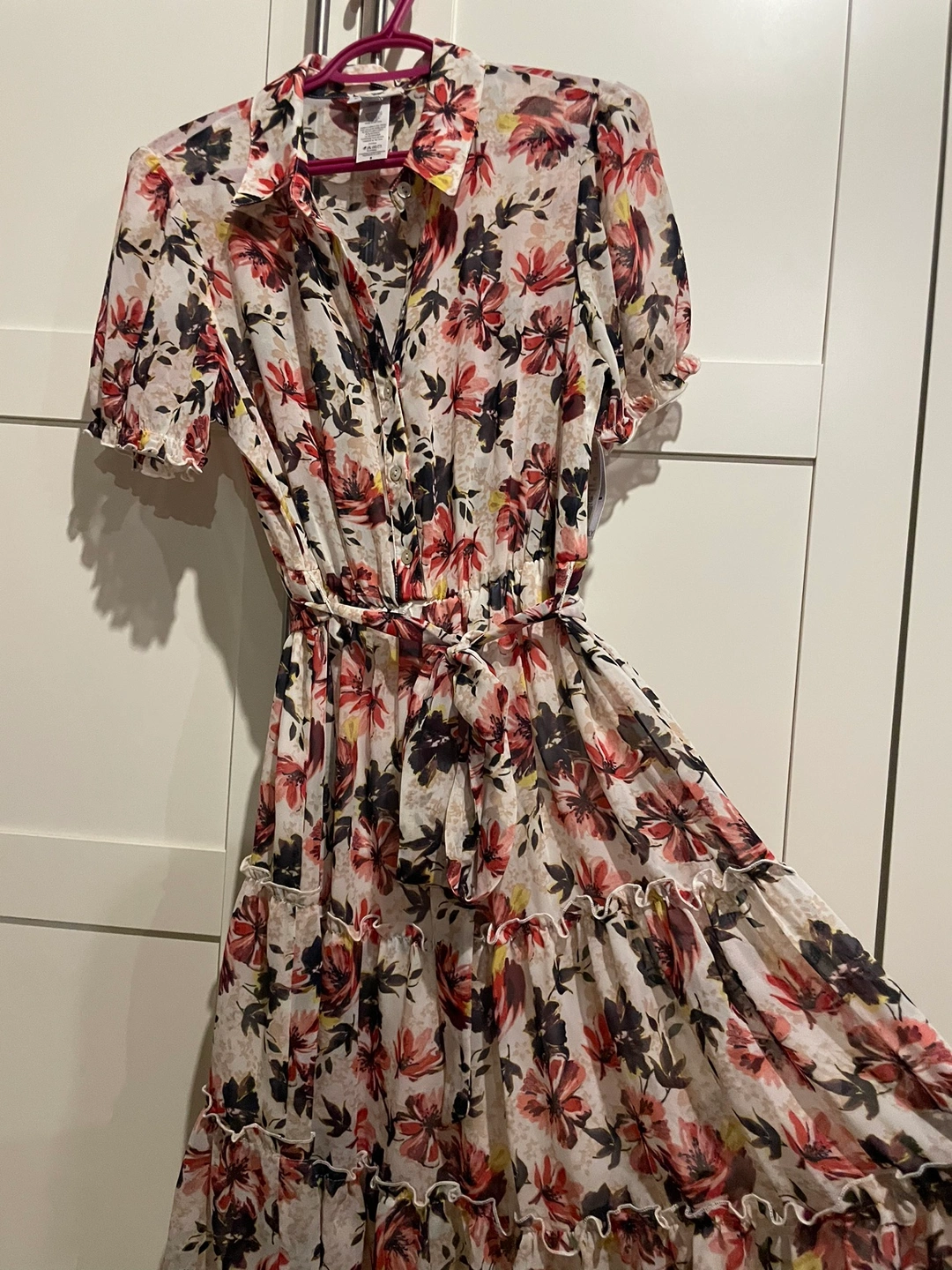 A beautiful midi dress with a floral print. It has a tie waist, short sleeves and a tiered skirt. It is perfect for a summer day or a special occasion.