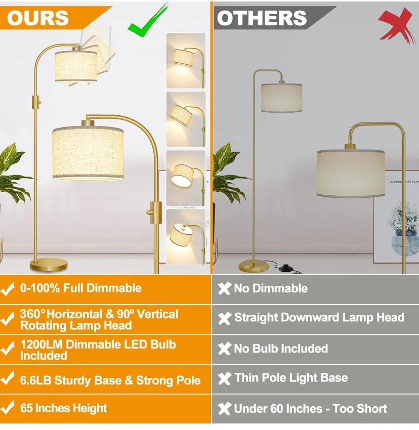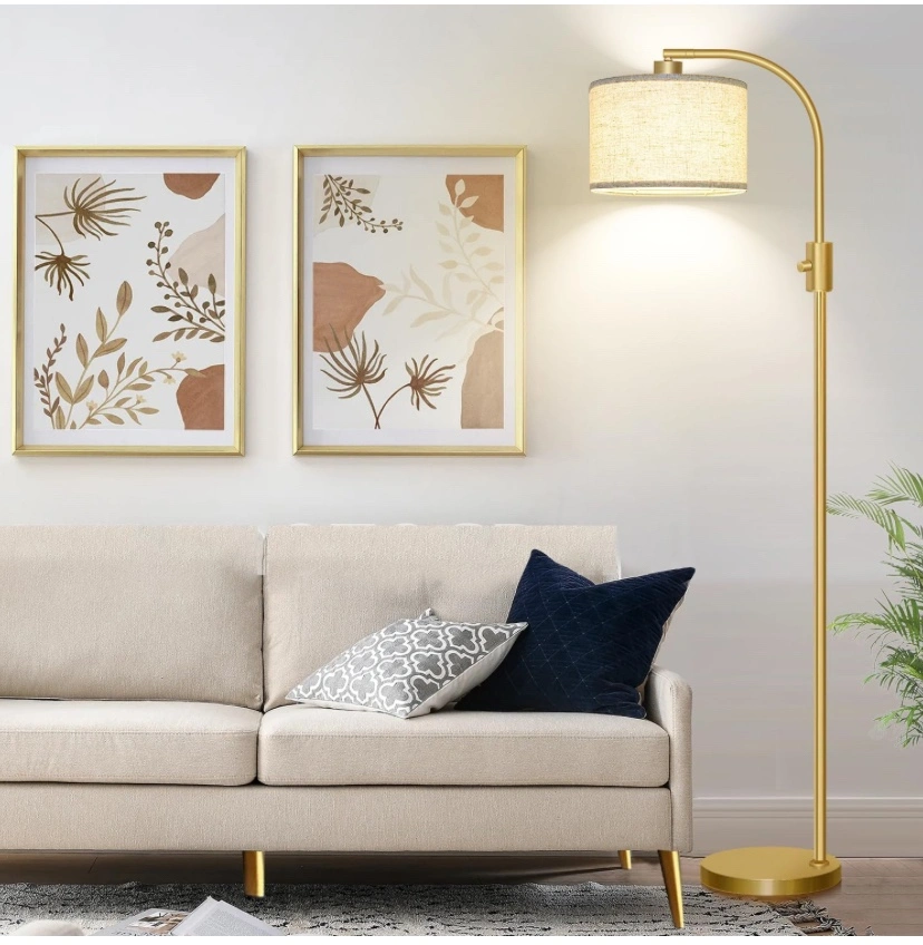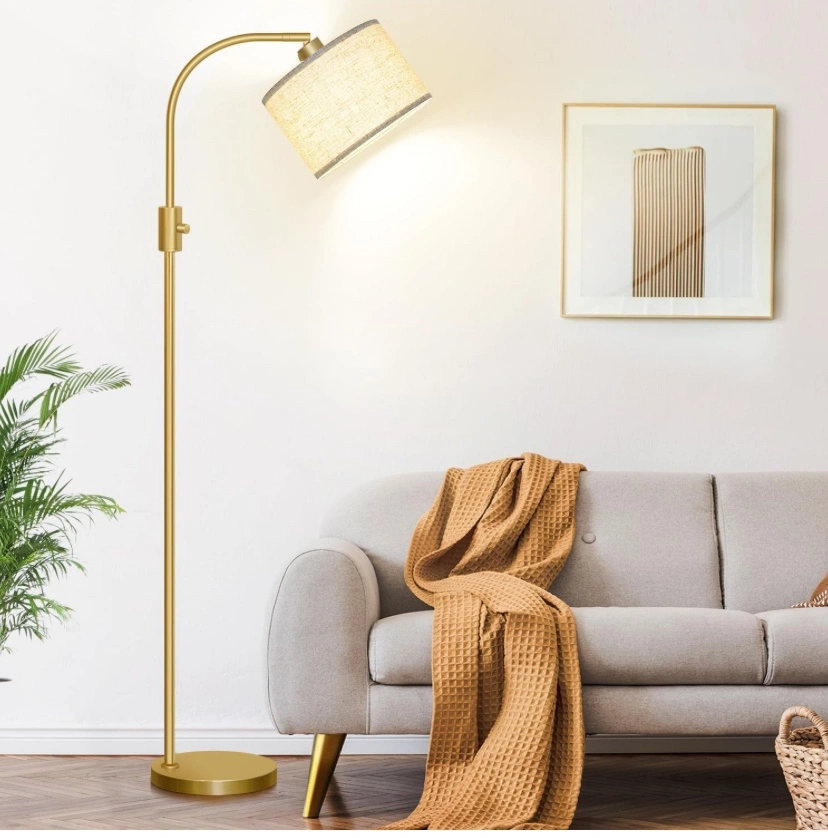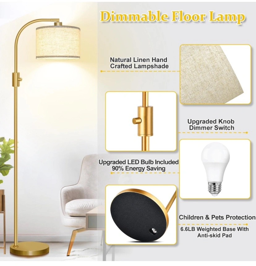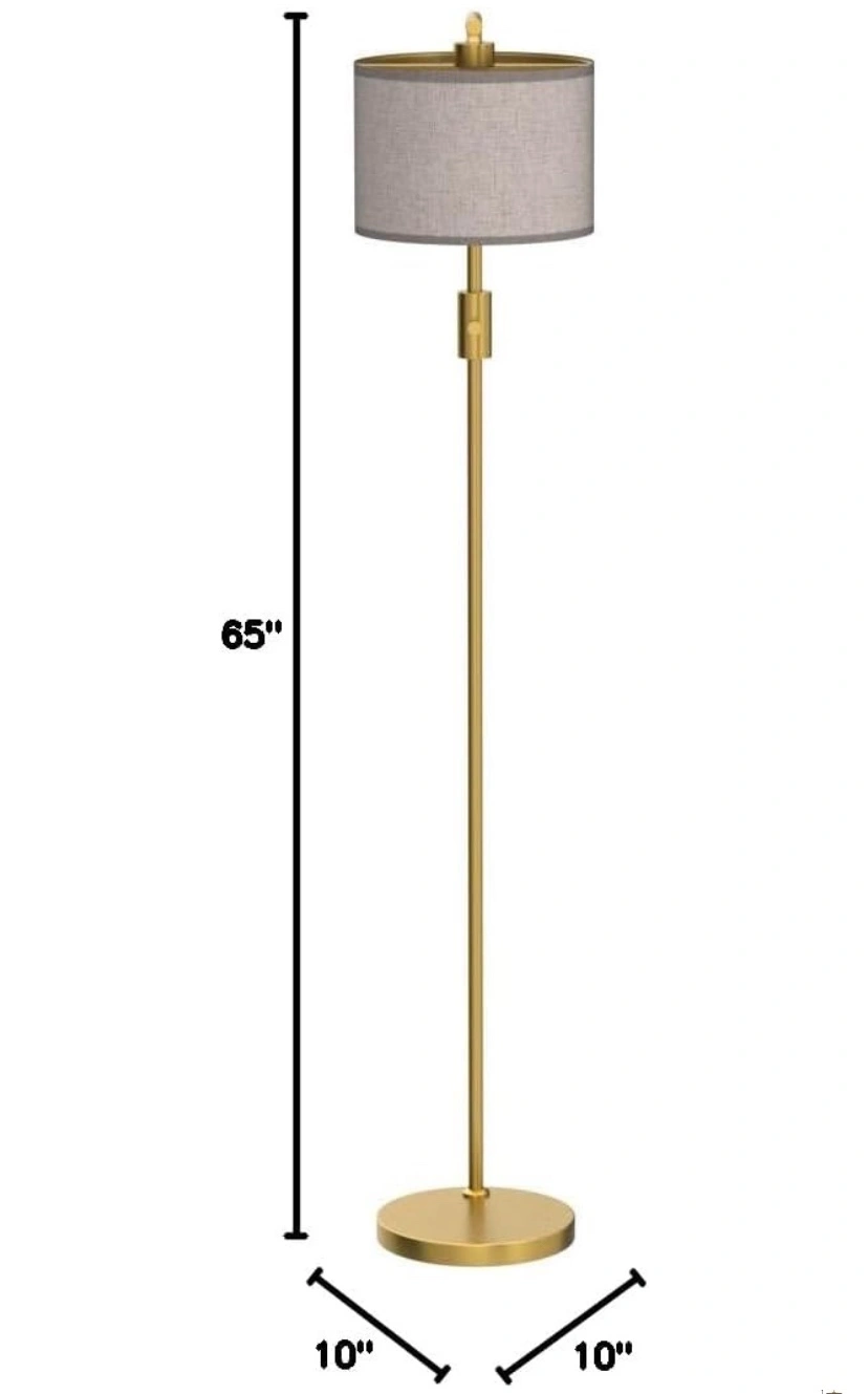 This is a gold floor lamp with a white linen shade. The lamp is 65 inches tall and includes a 1200LM dimmable LED bulb. The lamp has a 360 degree horizontal and 90 degree vertical rotating lamp head. The lamp is dimmable from 0-100%.