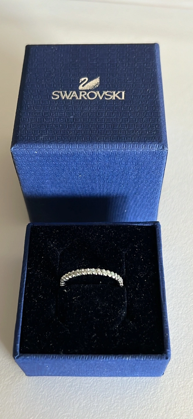 Swarovski ring with silver tone finish. Comes with the original box. No stones missing. Size 55. See images for sizing chart.