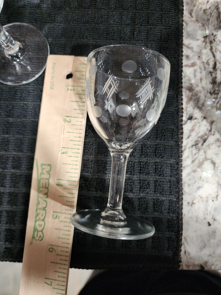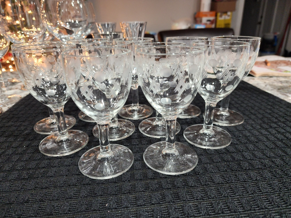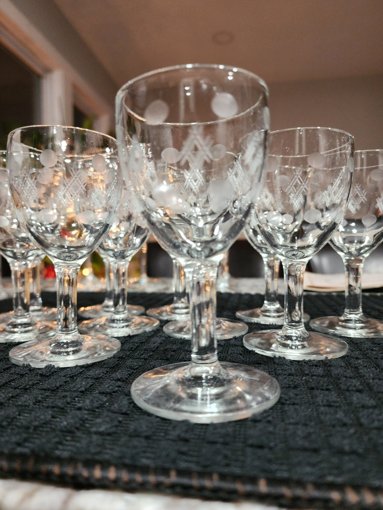 Set of 11 etched glass wine glasses, each glass stands approximately 5 inches tall. The design features an etched pattern of small circles, larger ovals, and a grid-like pattern. The etched glass design makes them look great empty or full of your favorite drink. Enjoy!