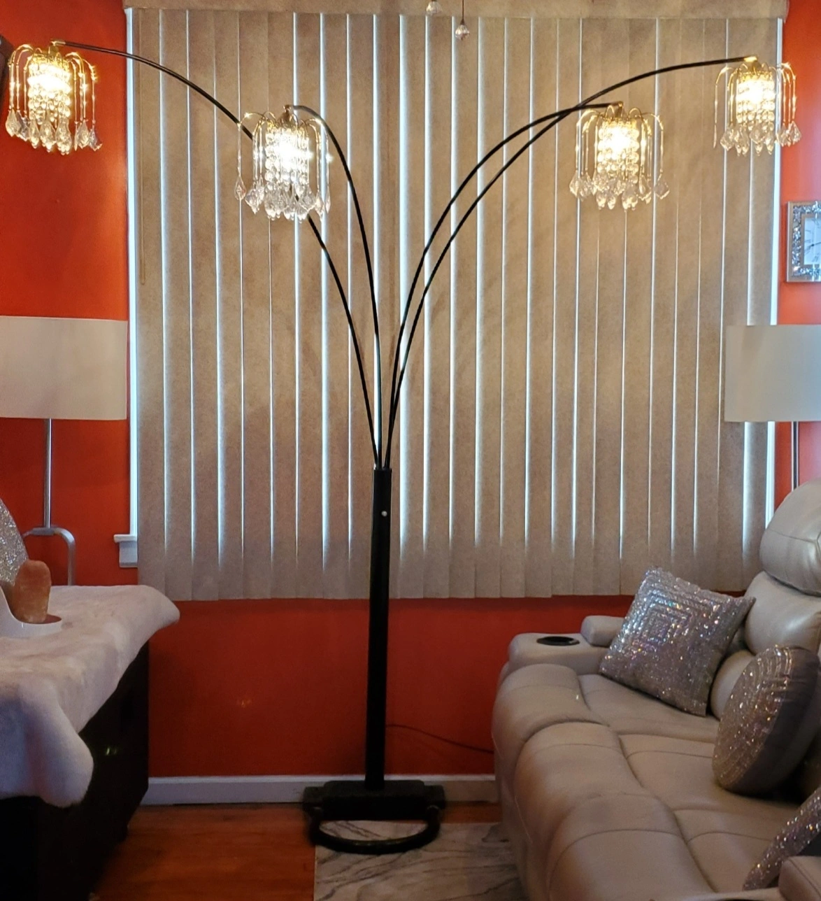 This is a floor lamp with a black base and four crystal shades. The lamp has an adjustable arm so you can direct the light where you need it.