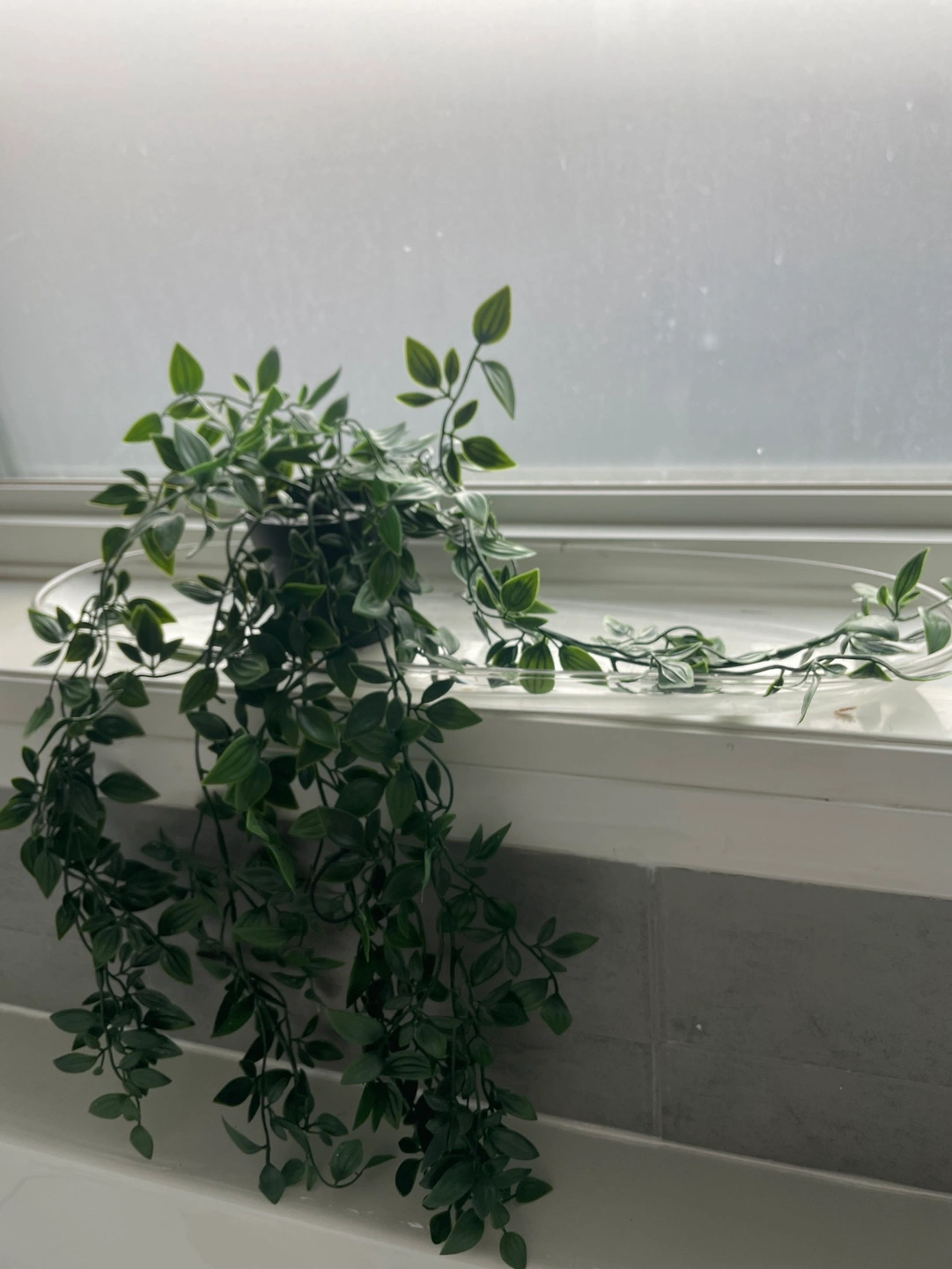 This is a large artificial hanging plant. It is great for adding some greenery to any space. It also comes with a oval glass
