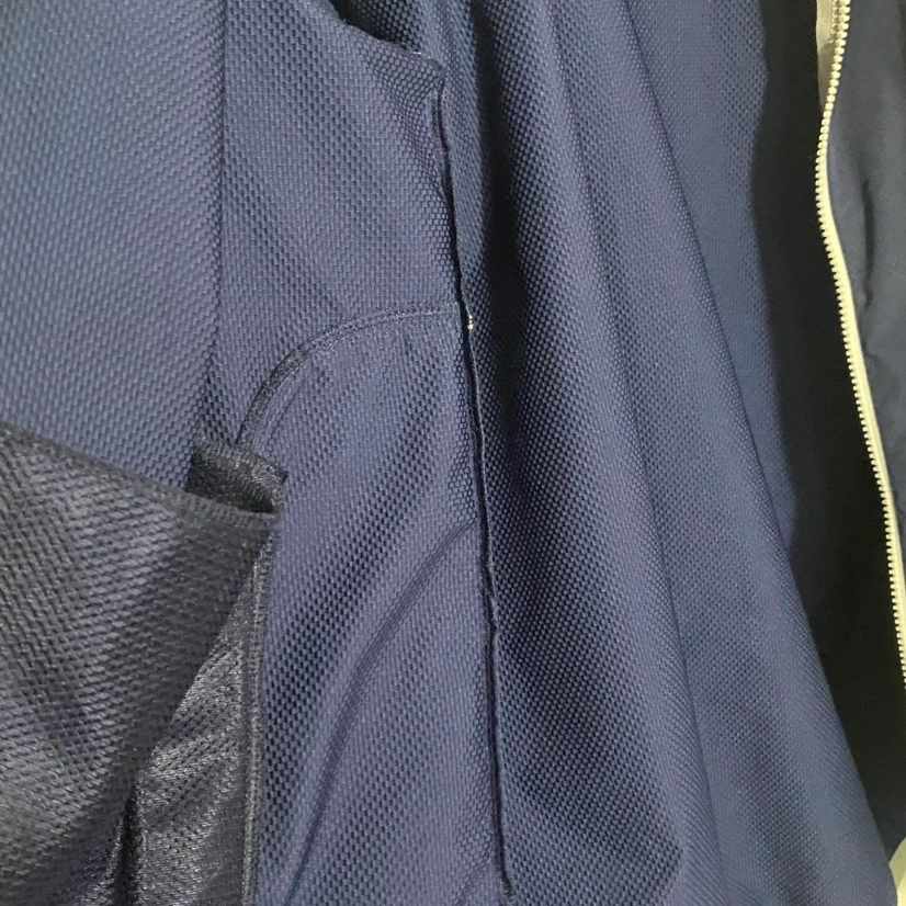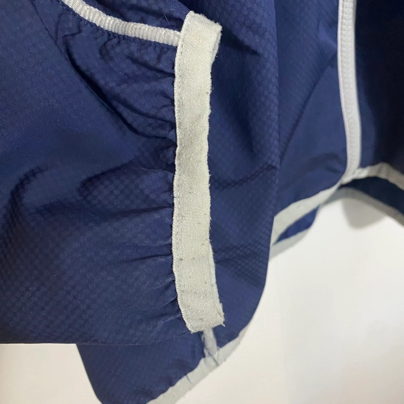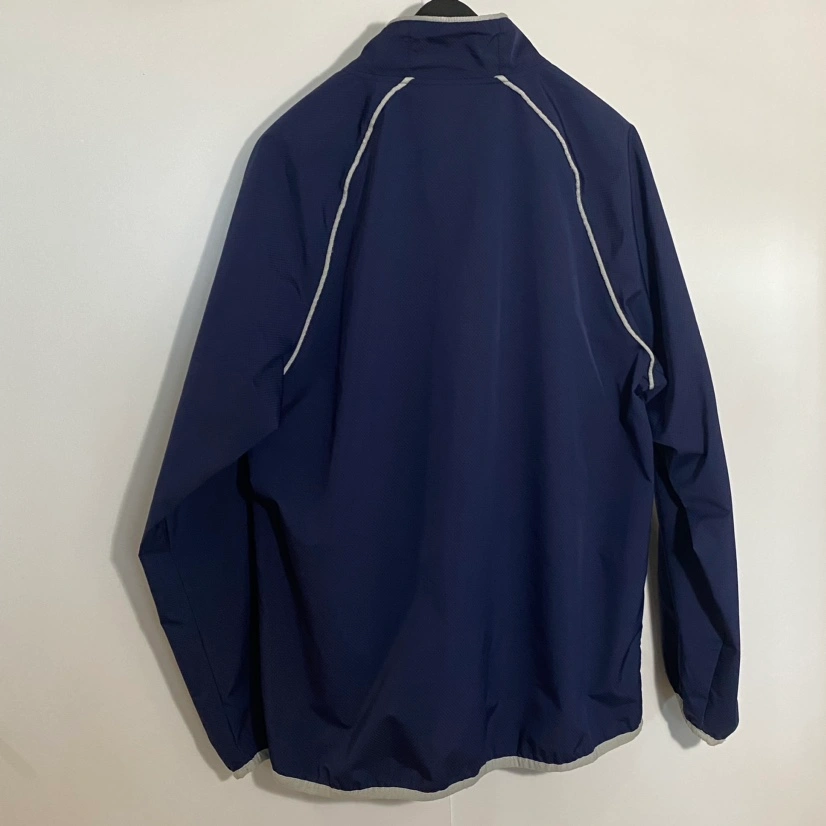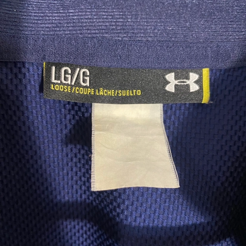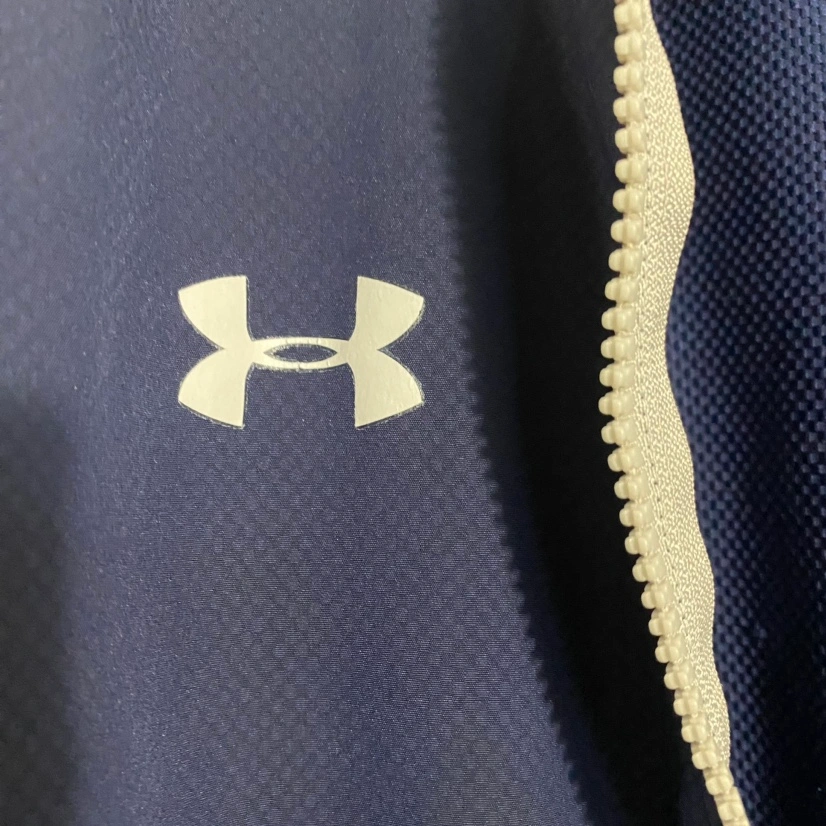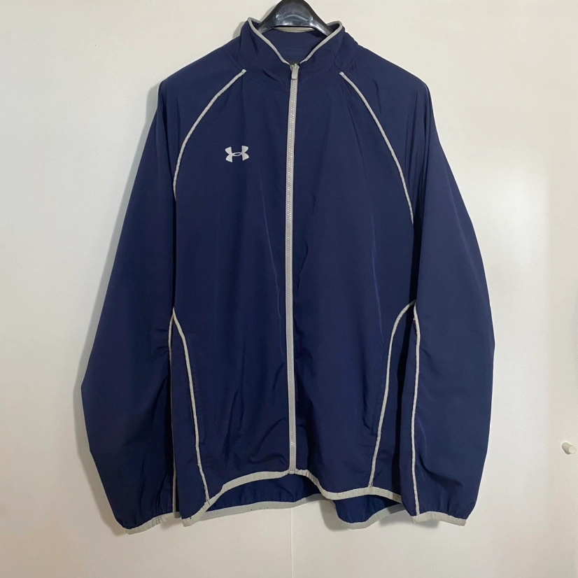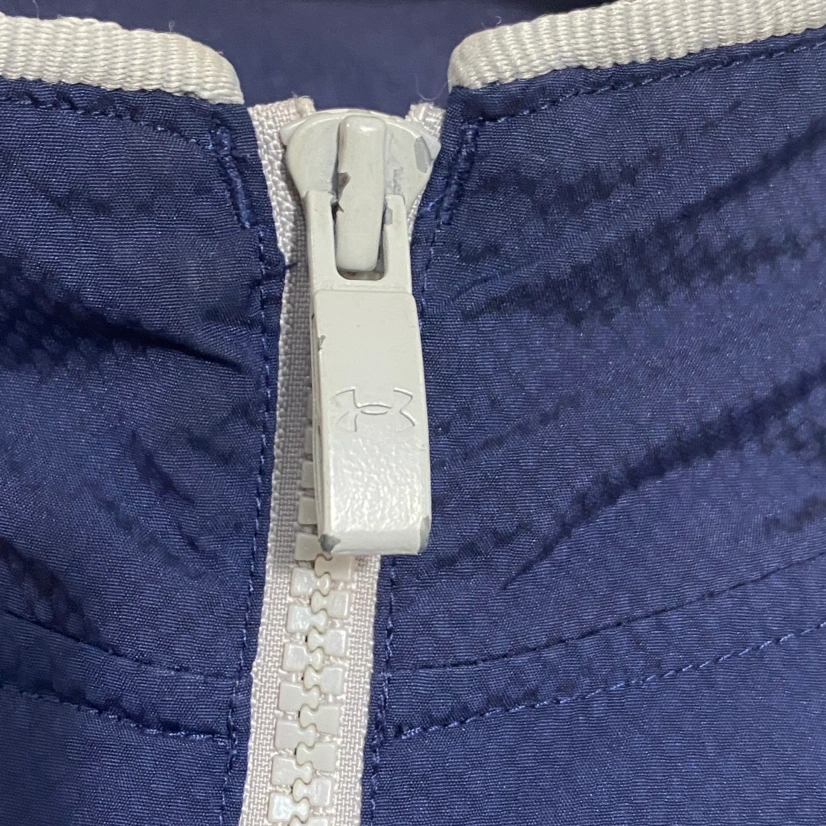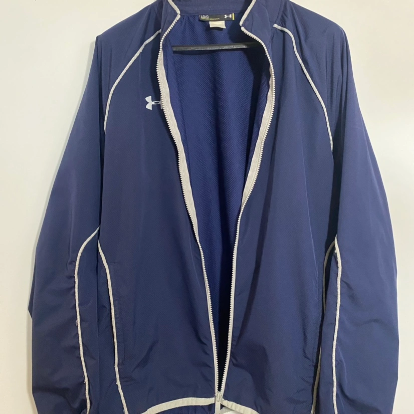 Navy blue Under Armour jacket with grey accents. Zipper closure with two pockets. Long sleeves with elastic cuffs. Size L. Good condition.