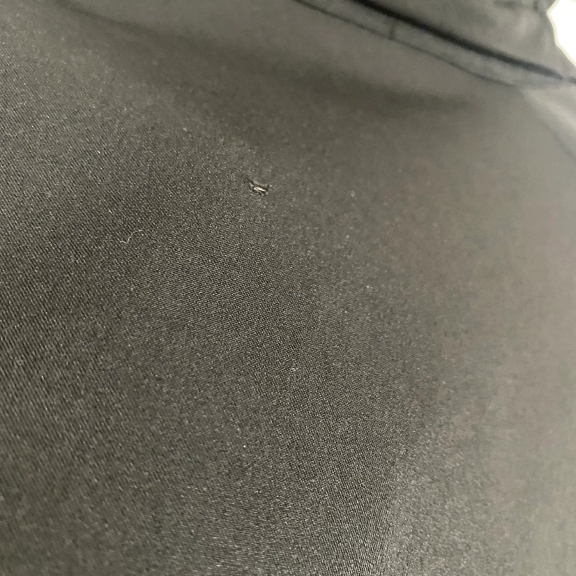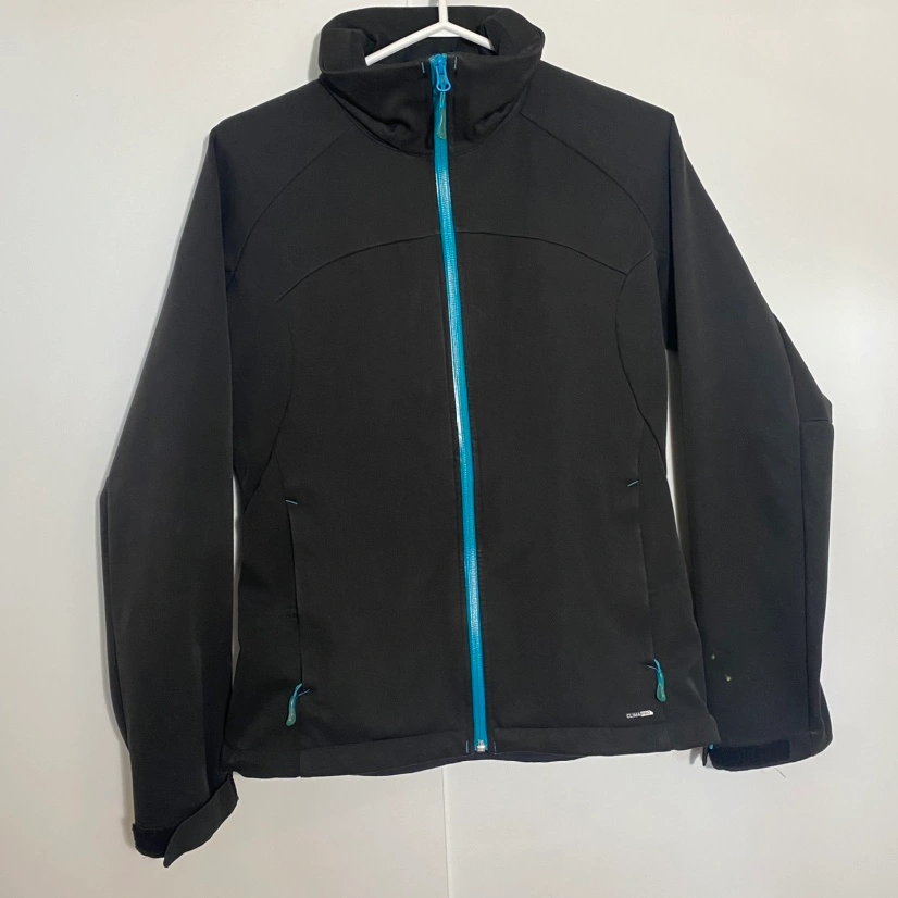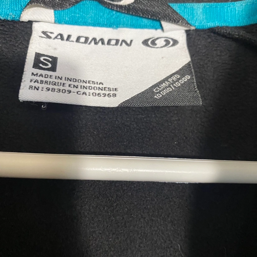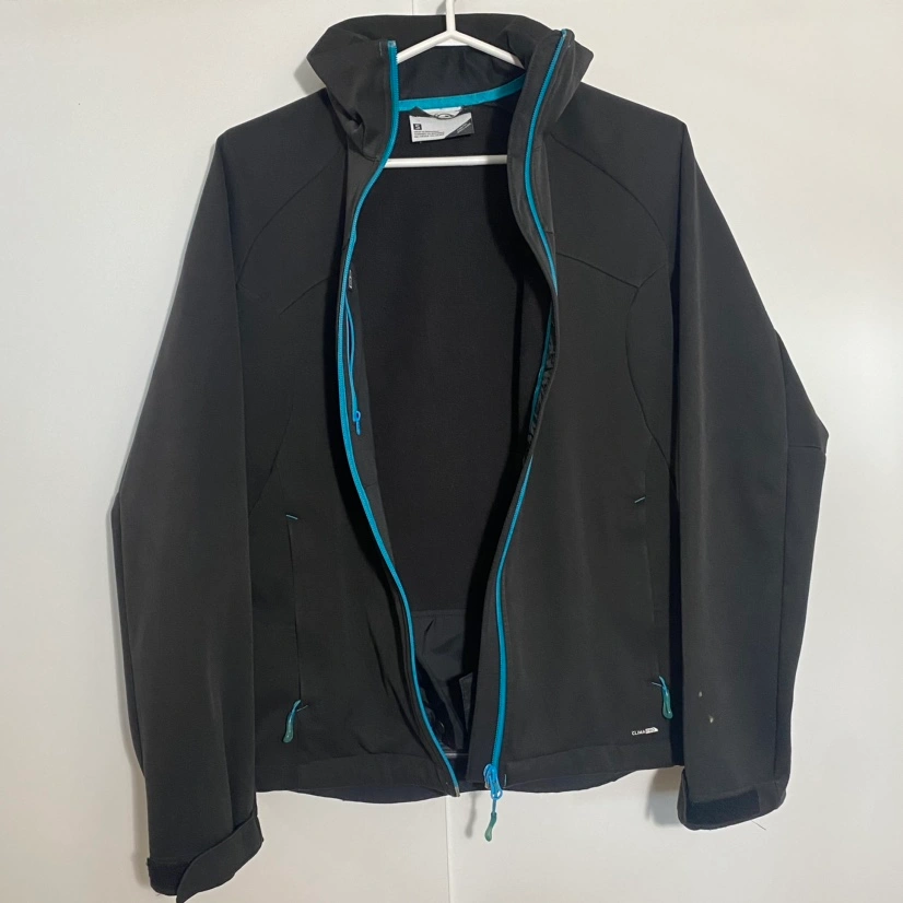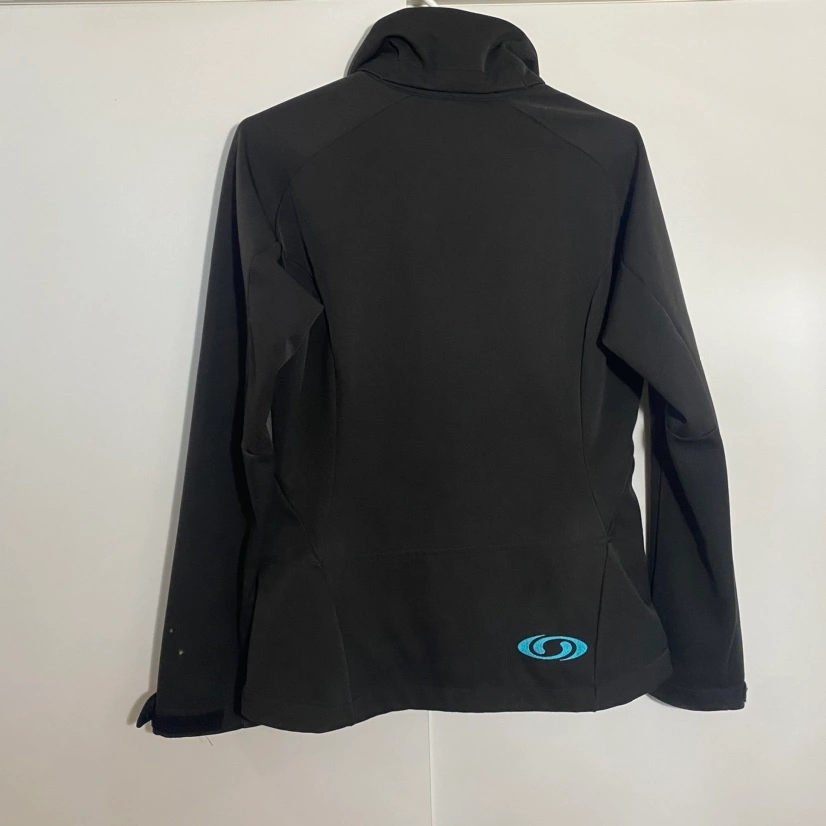 This is a black Salomon soft shell jacket with blue accents. It features a full zip closure and a hood. The jacket is in excellent condition. It is a great option for layering in cooler weather.