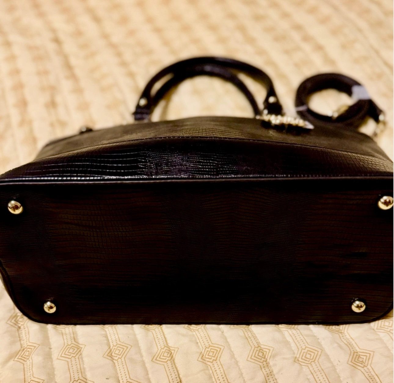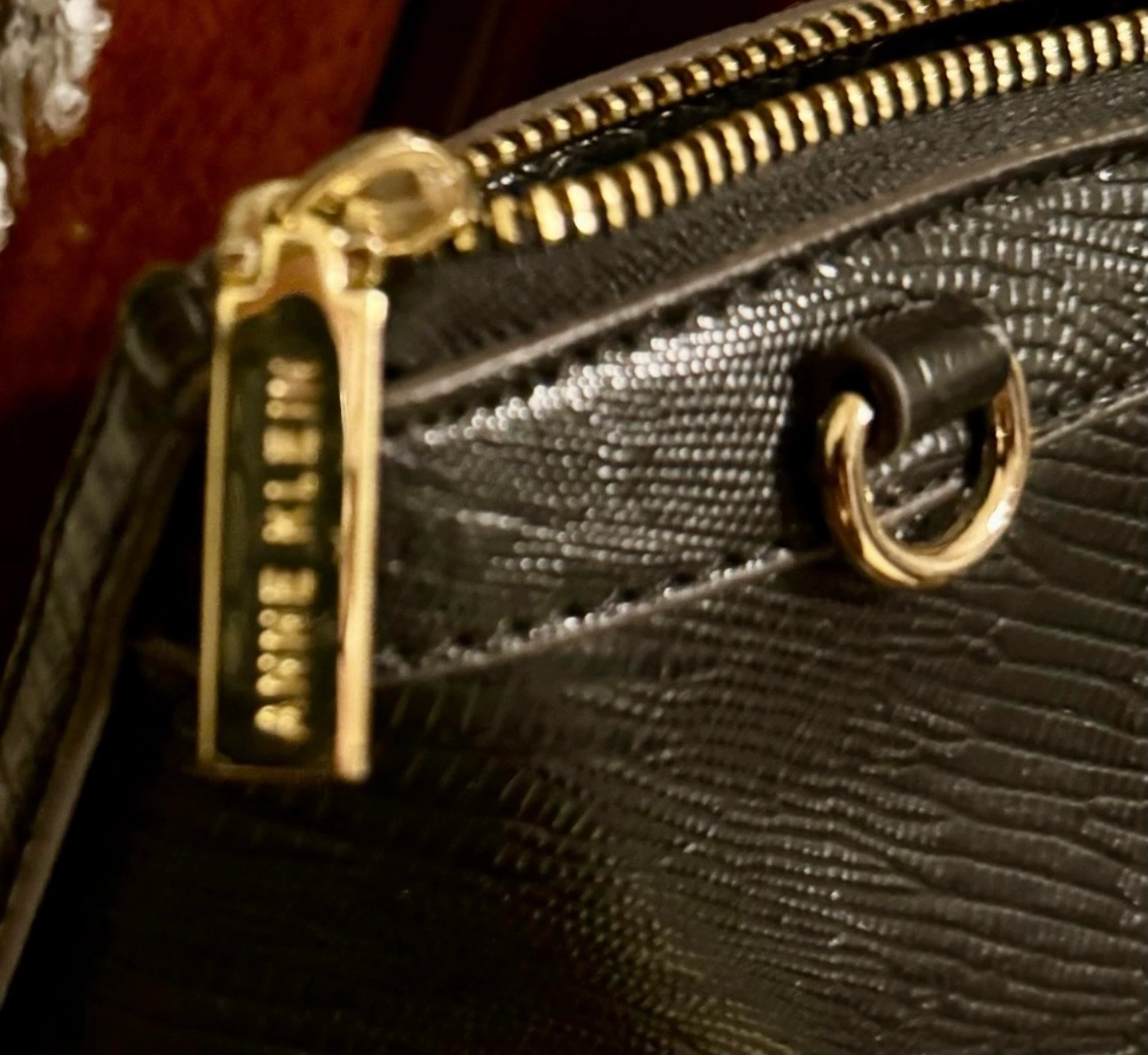 Anne Klein Black leather handbag with gold accents.