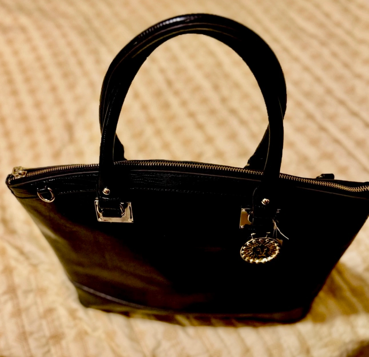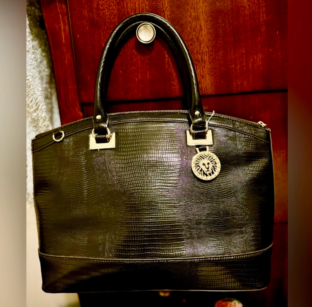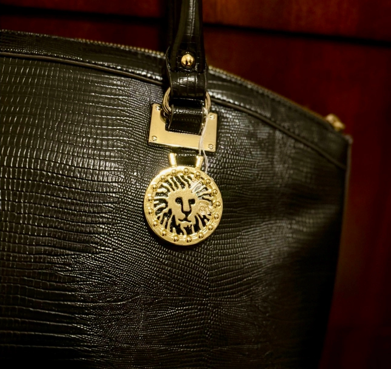 Features a lion head charm. Zipper closure and multiple compartments.