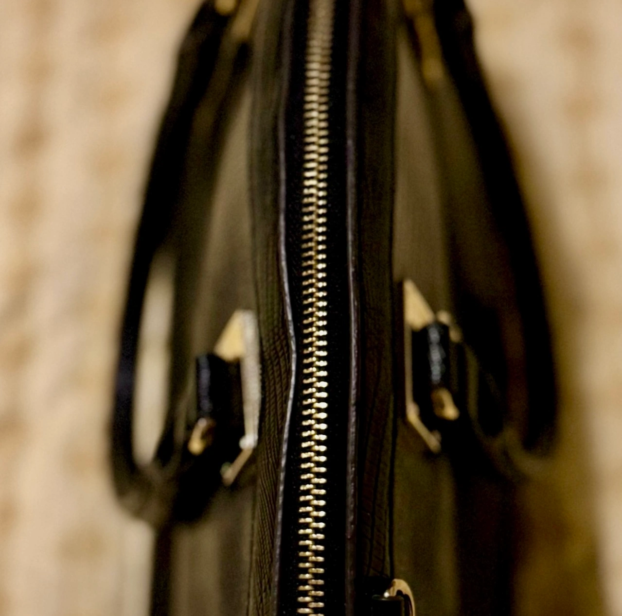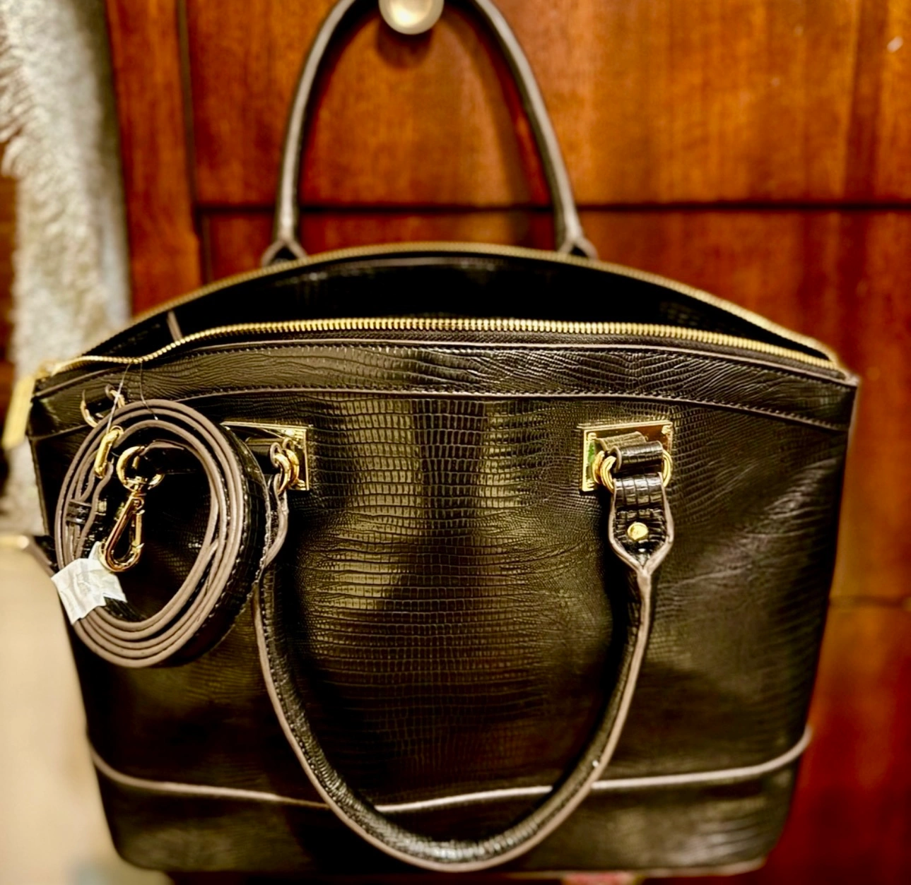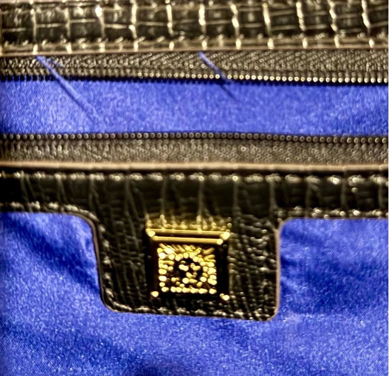 Features a lion head charm. Zipper closure and multiple compartments.