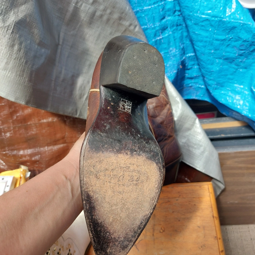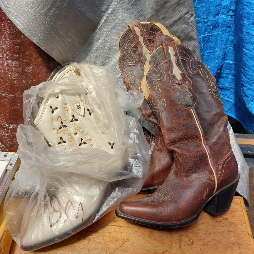 Women's brown leather cowboy boots. They are in good condition and have been worn. They have a stylish design with stitching detail and a pointed toe.