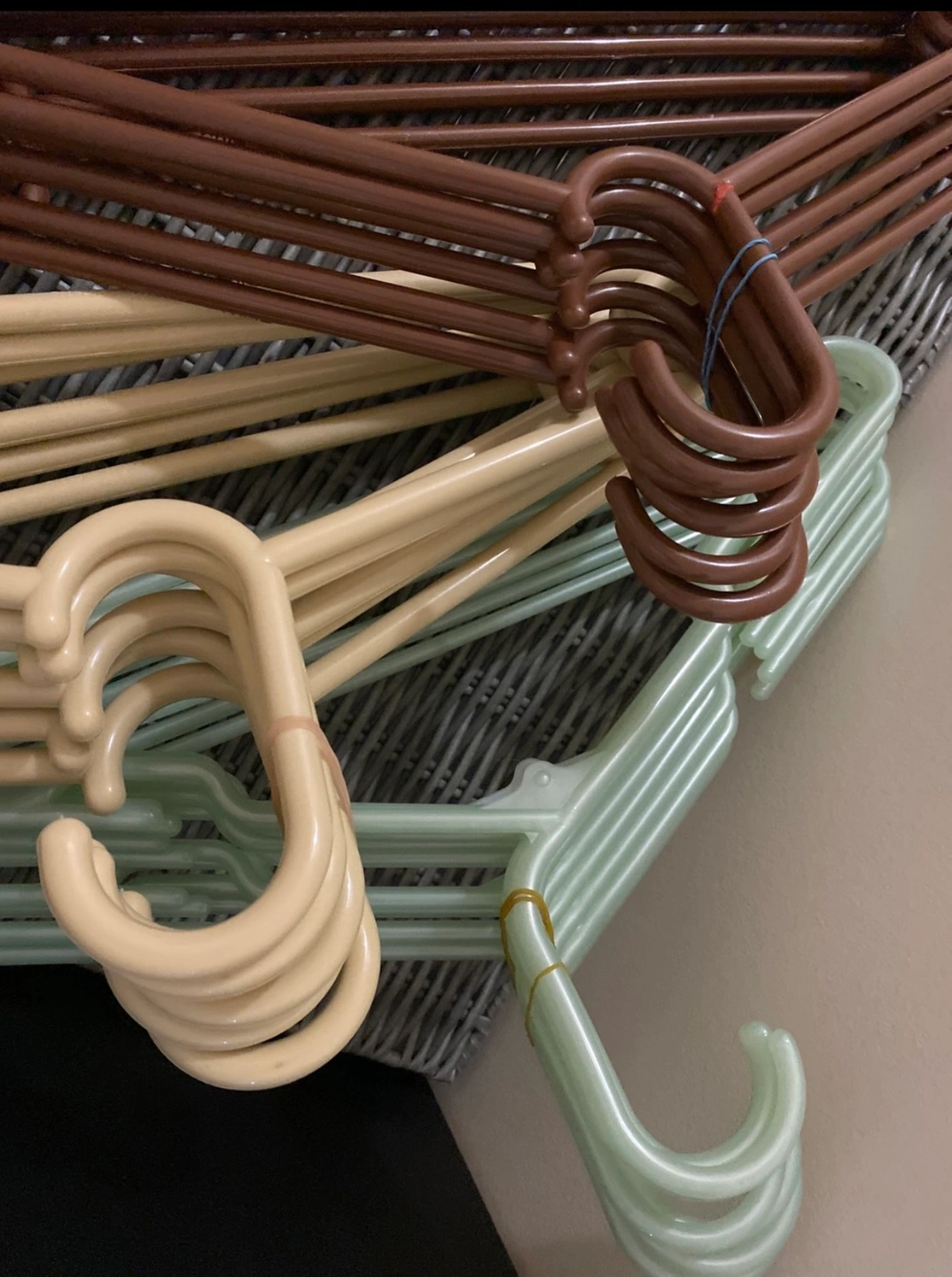 A bundle of plastic hangers in various colours. They are in good condition and ready to use
