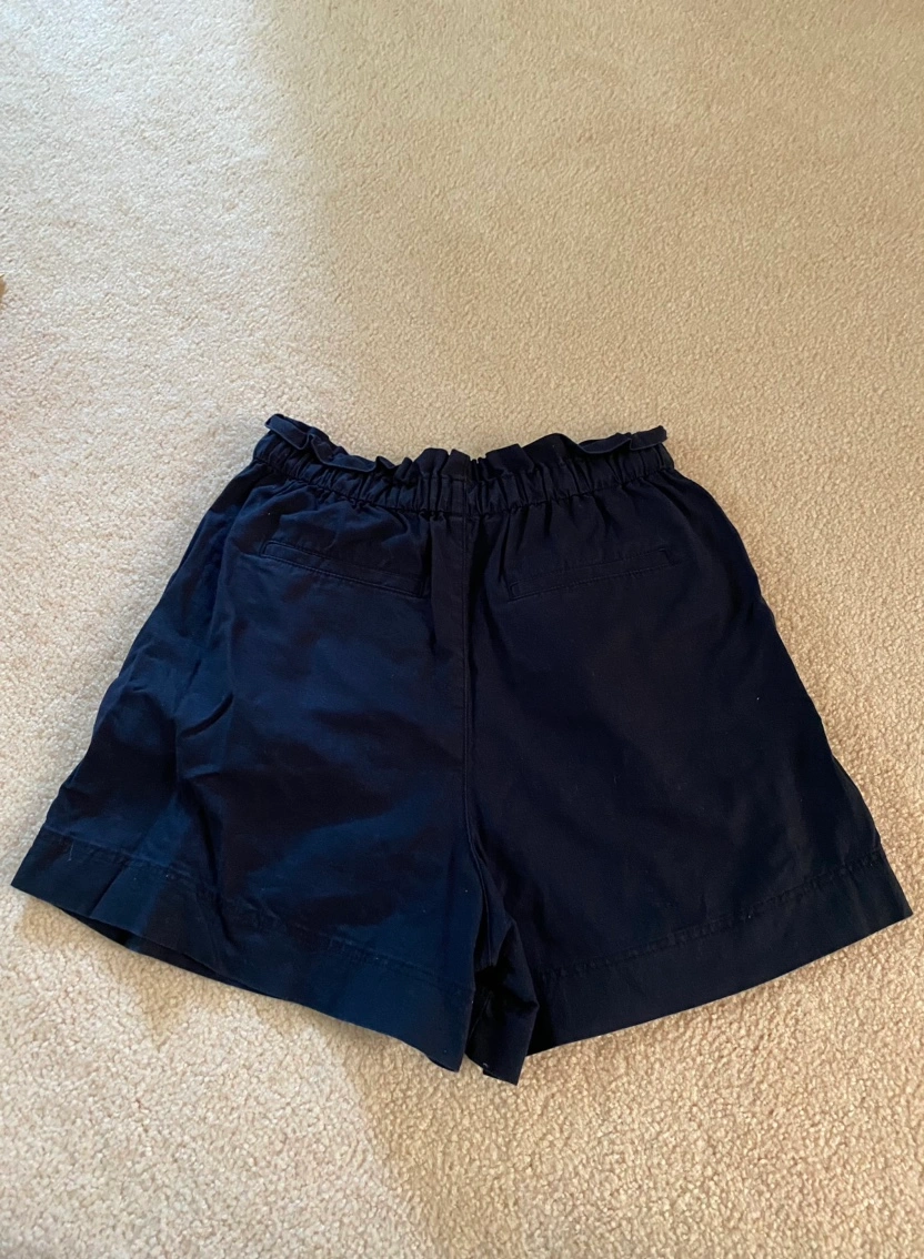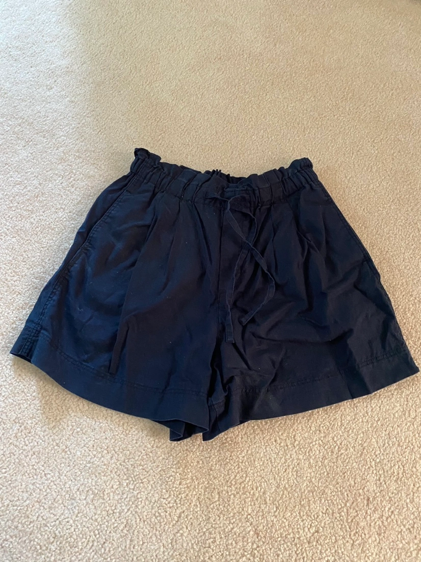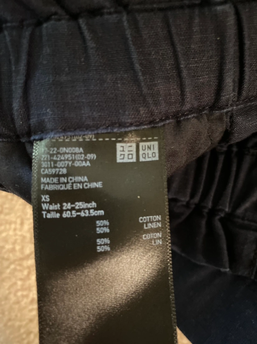 Size XS, black with 2 pockets in the front and 2 in the back. 50% cotton and 50% linen. Drawstring waistband. Made in China.
